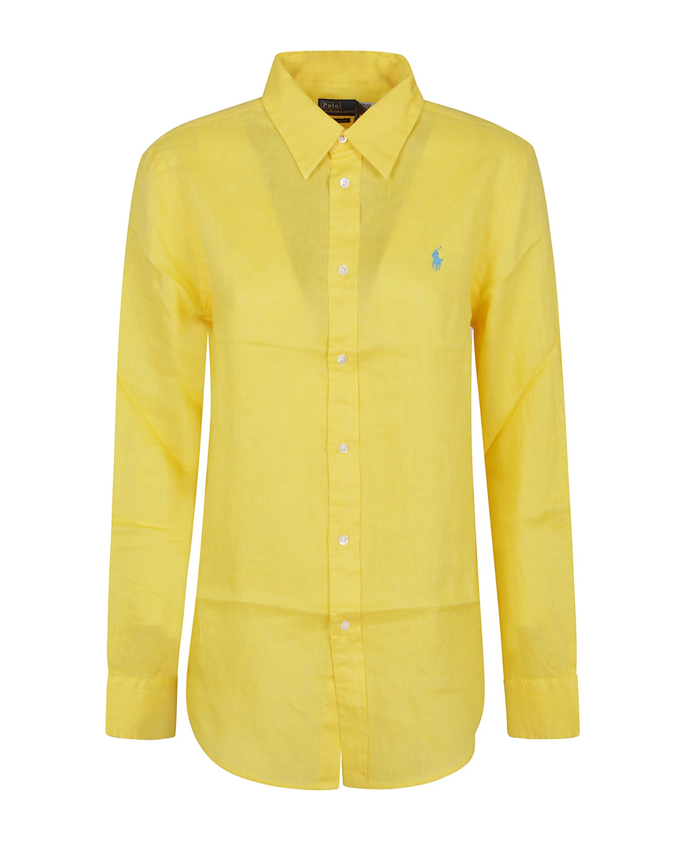 yellow linen shirt with white mother-of-pearl buttons pointed collar and buttoned cuffs. classic light blue polo pony embroidered on the front.