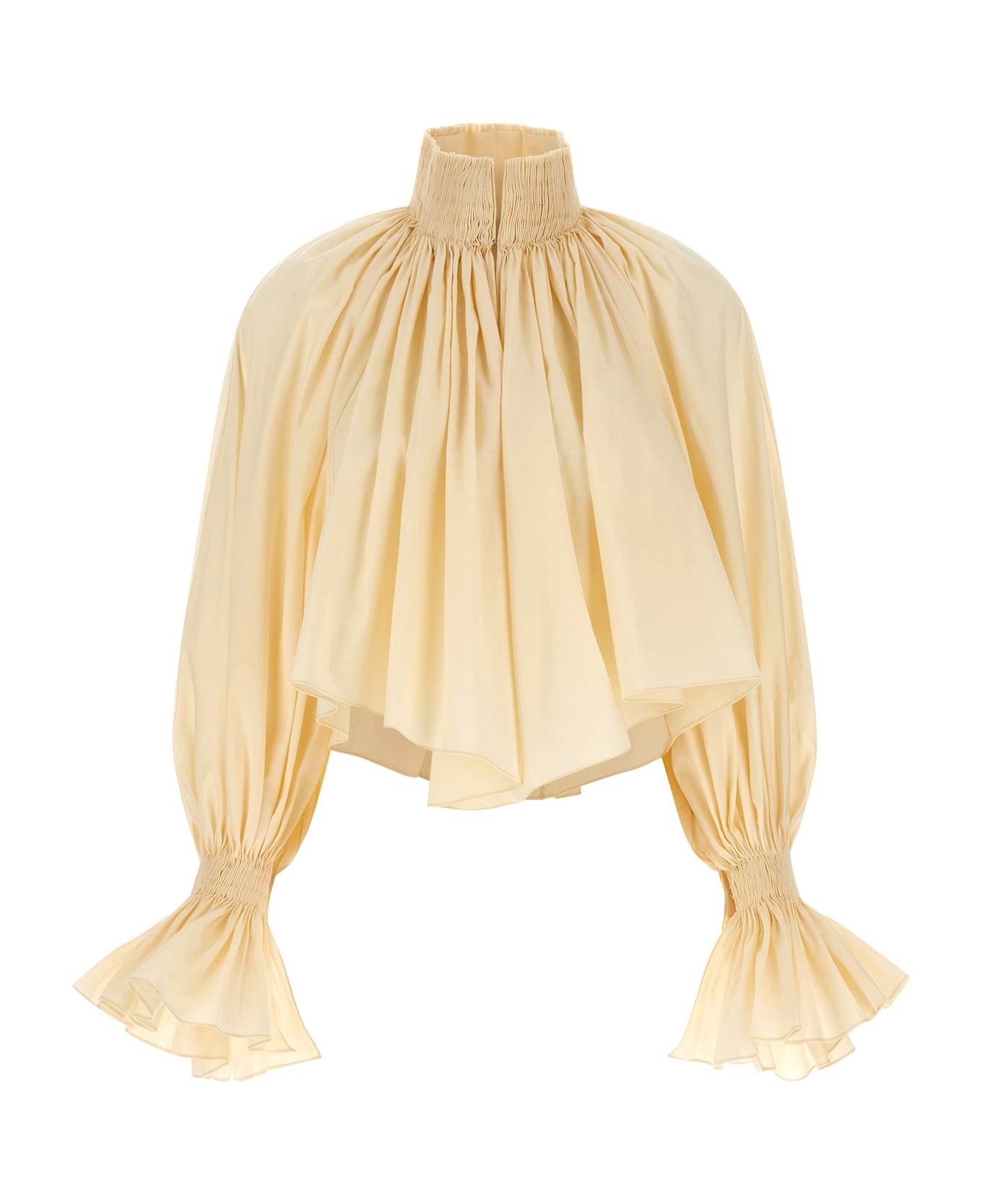 'Durer' soft cotton canvas shirt, crop model, hand-wrinkled cartridge pleat construction, pleated high neck with hook closure and cut-out V-out detail, long wide puff sleeves with cuffs, asymmetric hem. It can be worn with a neckline with slit on the front or back.