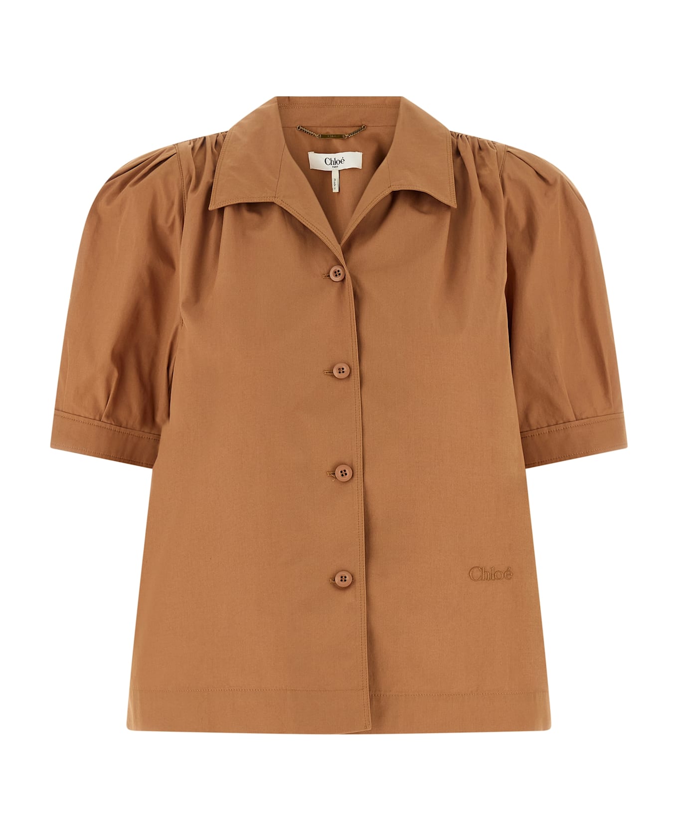 Cotton poplin shirts with straight silhouette, tone-on-tone embroidered logo and front button closure, curled top and shoulder, wide short sleeves, side slits on the hem. SUSTAINABLE: This product is made with organic cotton.