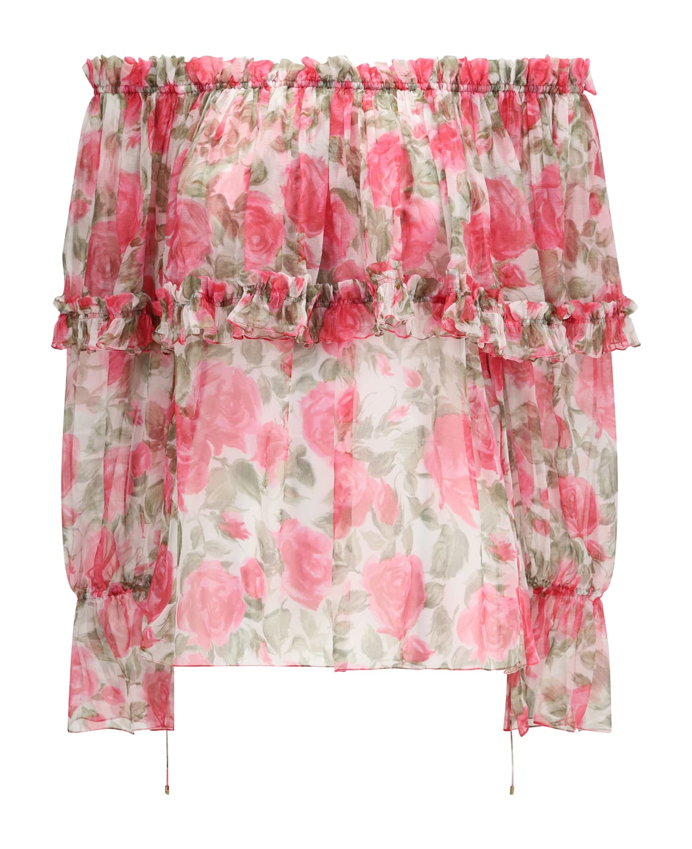 The off-shoulder floral print silk top by chloé stands out for a fluid silhouette that enhances the figure with light and feminine elegance. the off-shoulder floral print silk top model by chloé is crafted in silk and features an off-shoulder construction with long puff sleeves that introduce movement to the design. the all-over floral print enriches the surface of the garment with a delicate decorative accent. a soft fit completes the off-shoulder floral print silk top by chloé with a natural and airy silhouette.