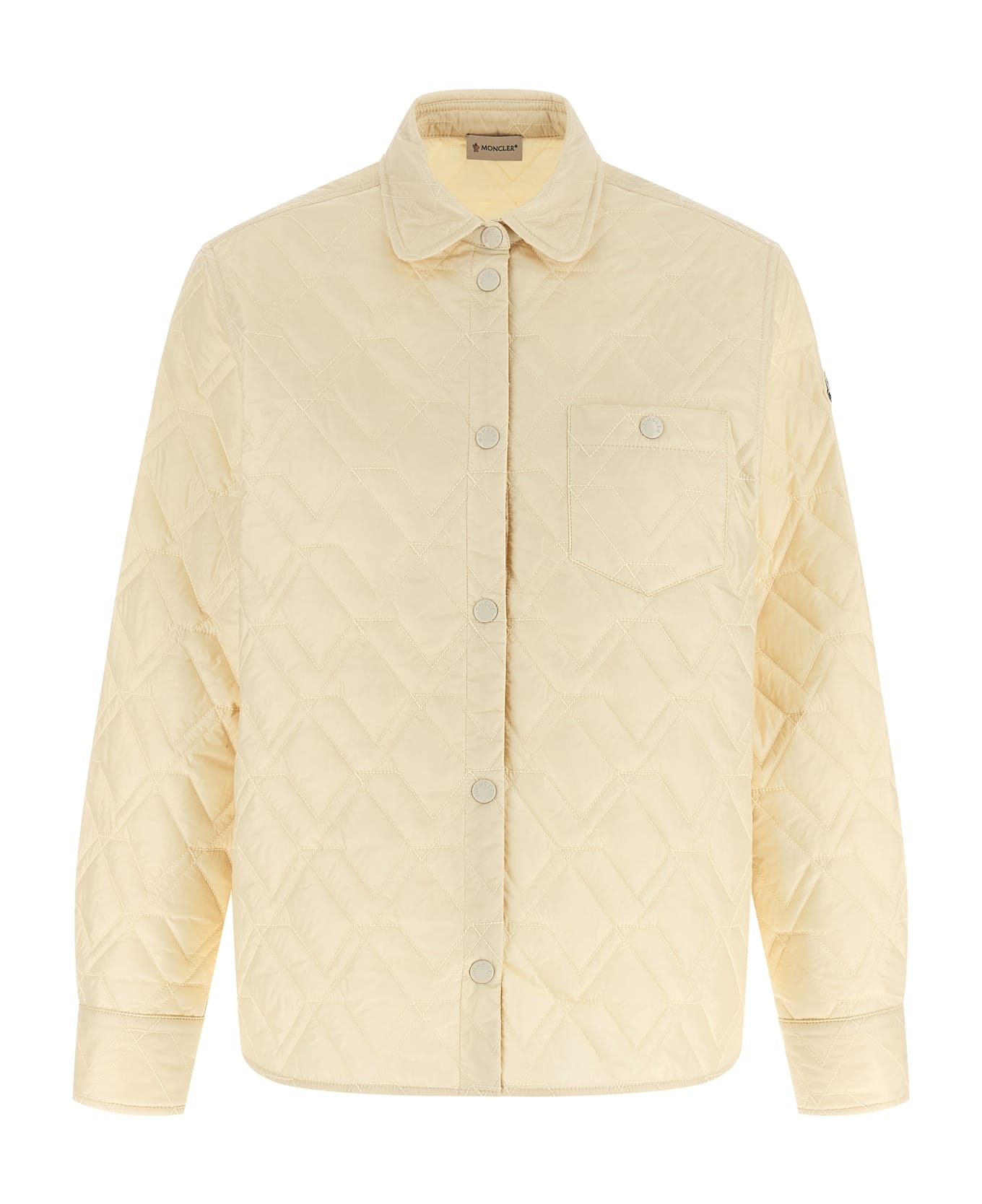 Quilted tech fabric overshirt, front snap button closure, breast pocket, long cuffed sleeves and felt logo patch.