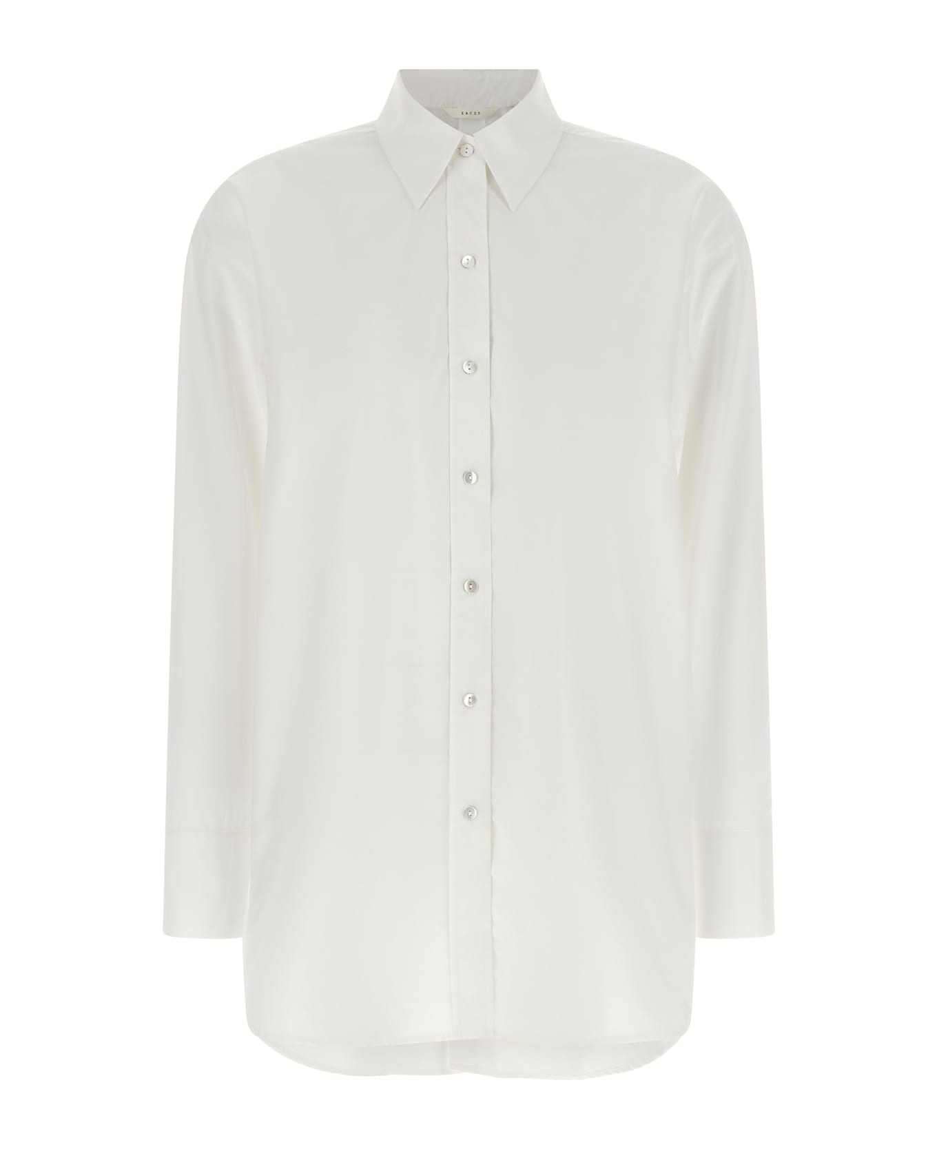 'Scarlet' cotton poplin shirt with mother-of-pearl button closure at the back and on the sleeves, pointed collar, long sleeves with cuffs and dropped shoulders, rounded hem.