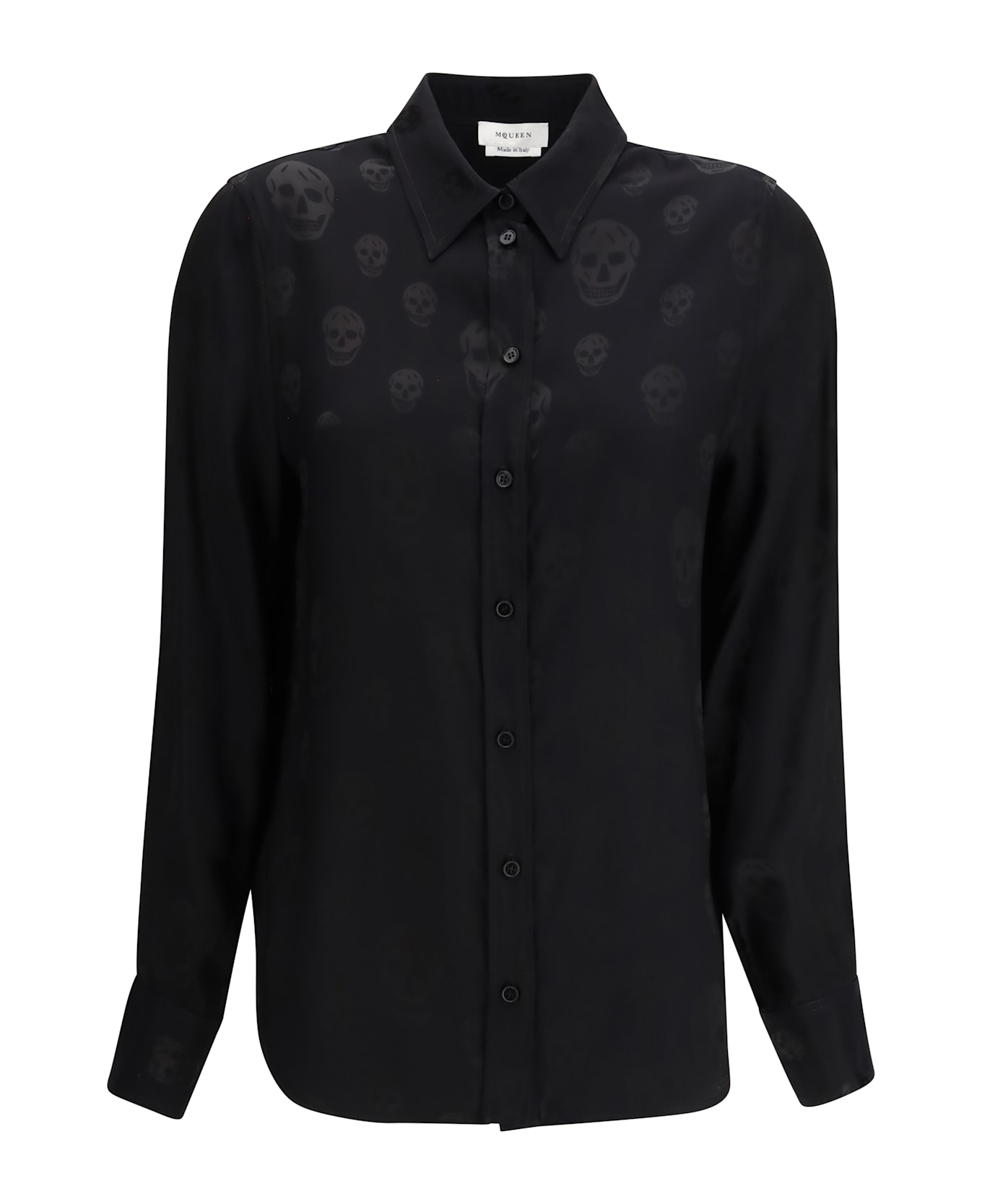The shirt with skull motif by alexander mcqueen conveys contemporary elegance with a bold, refined attitude. the subtle, lightly shimmering skull pattern runs across the entire surface and extends to the collar, balancing iconic symbolism with timeless style. crafted from high-quality viscose, the fabric feels light, fluid, and softly lustrous. the slightly relaxed fit, long sleeves with buttoned cuffs, and front button fastening give the shirt a classic structure, reimagined through a modern lens. a distinctive piece designed to elevate sophisticated looks with understated edge and unmistakable character.