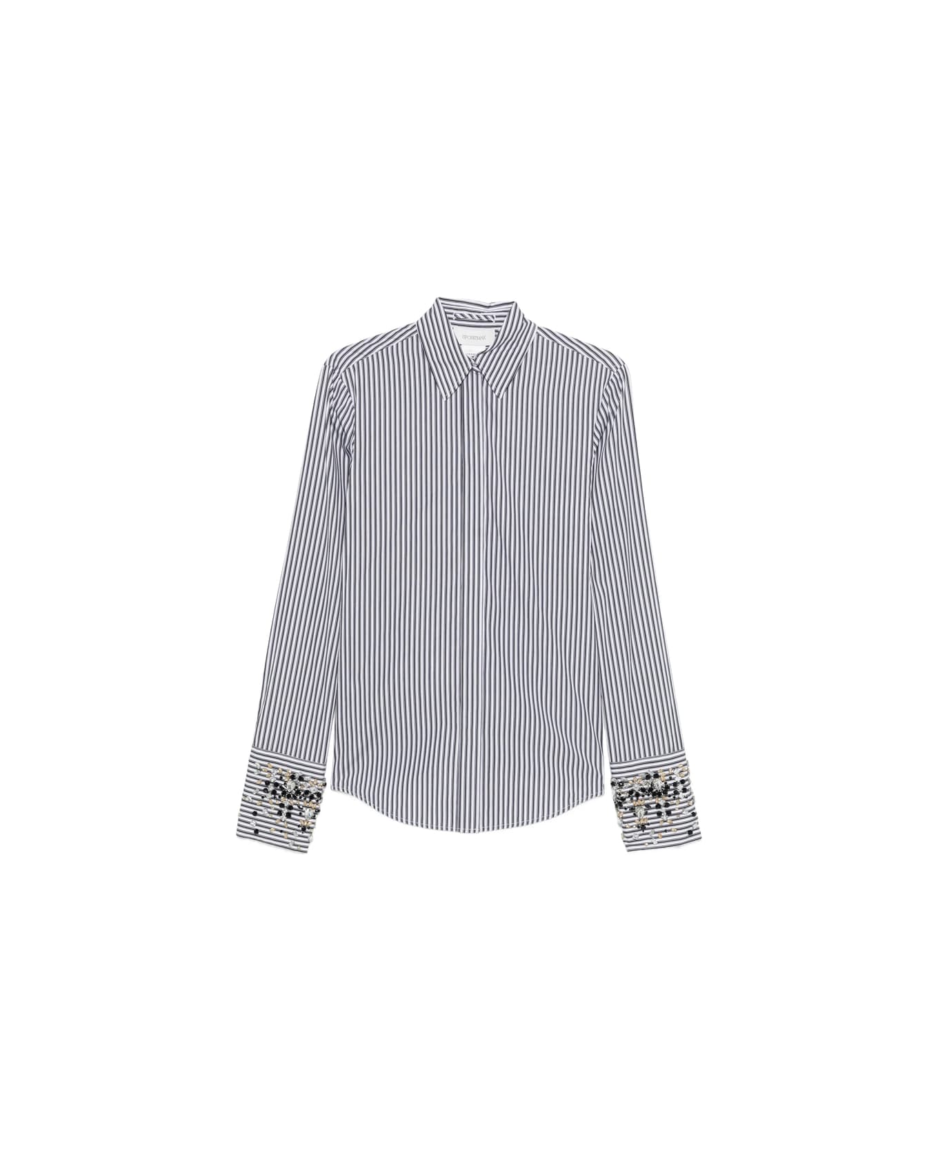 white and black striped embellishments at the cuff button fastening pointed collar long sleeves