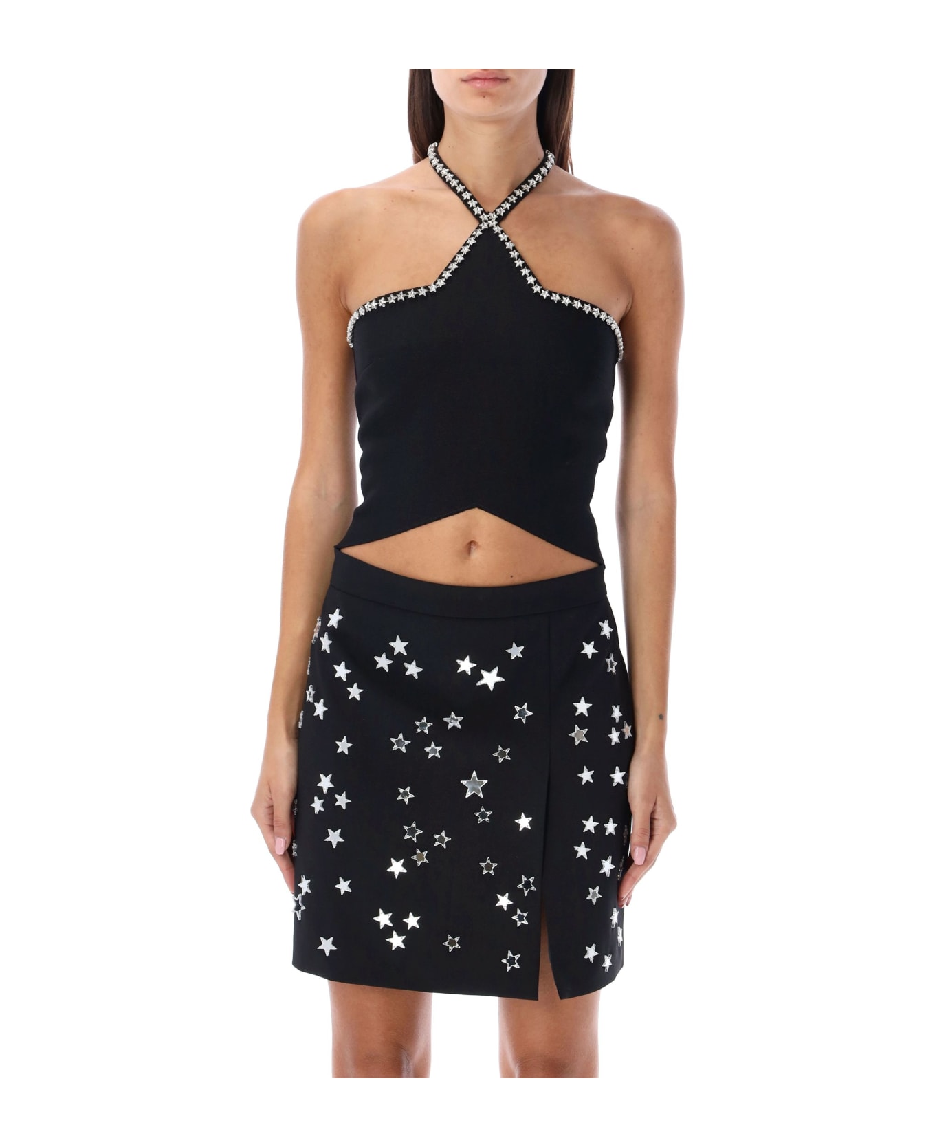 Stretch Star-crystals Halterneck Top By Msgm. Featuring: Halterneck Star Rhinestones Embellishment At Neckline Rear Zip Fastening Cropped And Asymmetric Hem Model Is 1,72 M Tall And She's Wearing Size 40