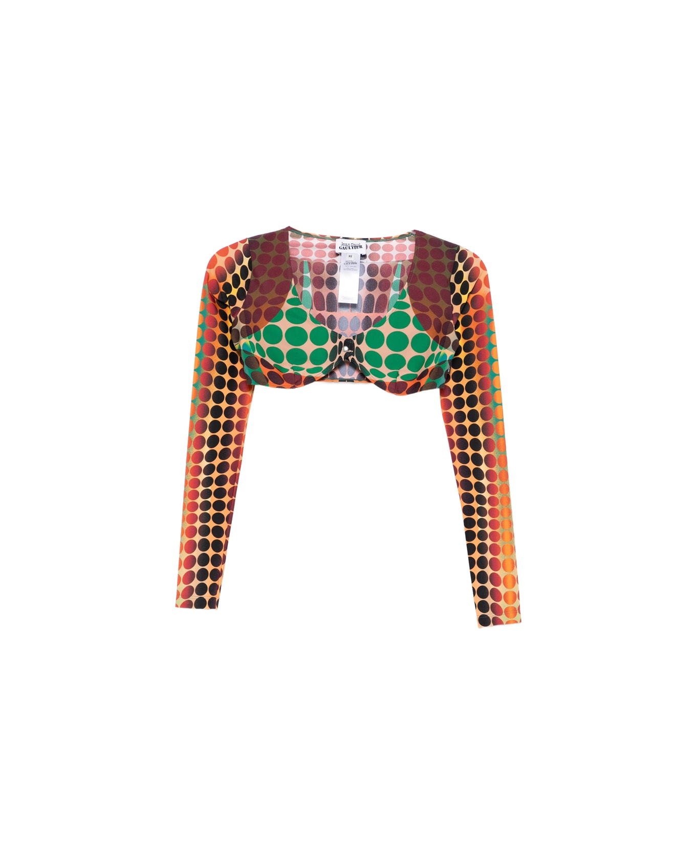 orange, blue and brown polka dot pattern long sleeves cropped bra detail round neck