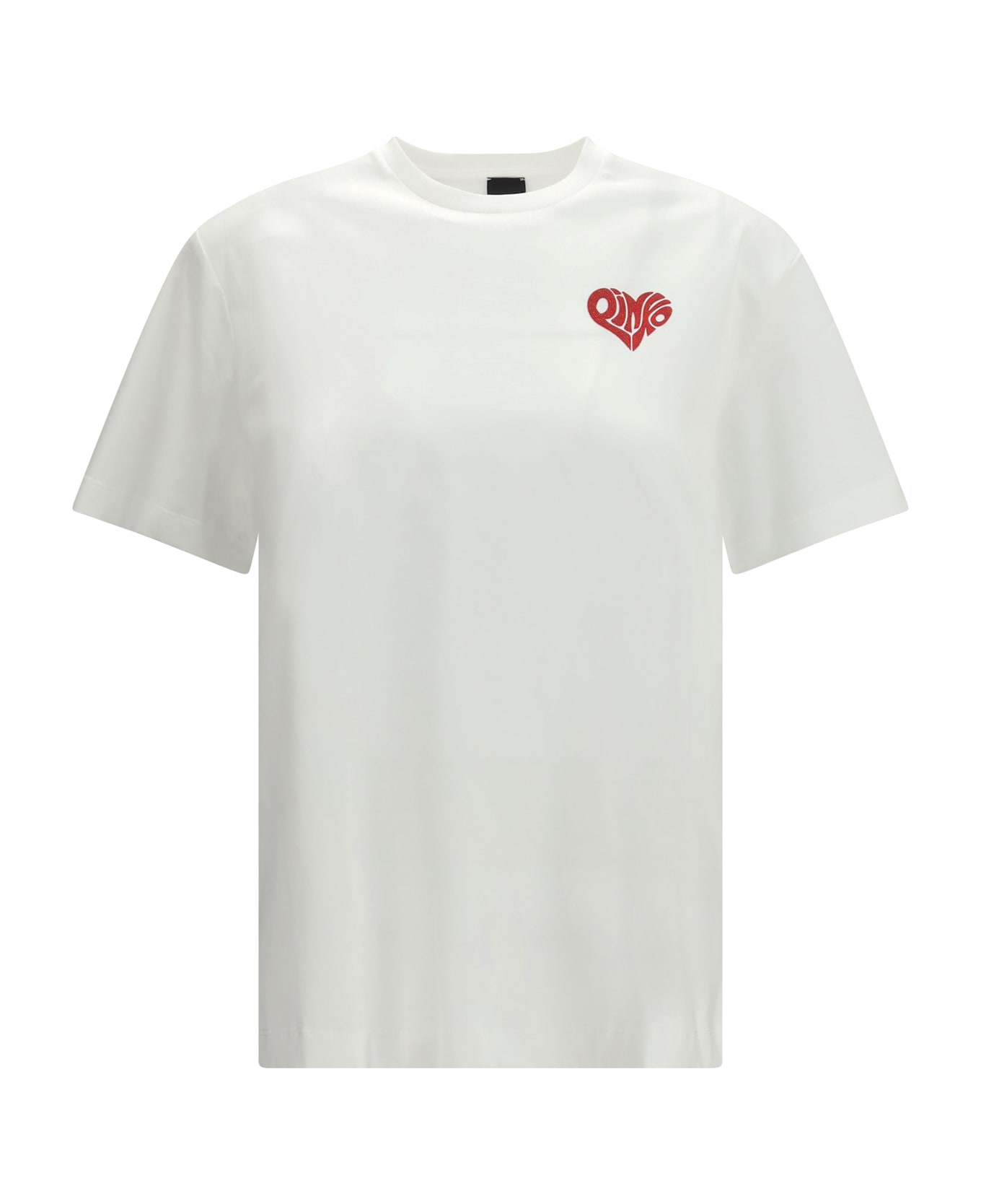 The strepitoso t-shirt by pinko is a garment with a modern and bold appeal. the crew neck offers a comfortable fit, while the brand logo, embellished with rhinestones, is located at the top left, adding a touch of sparkle and style. on the back, the repeated word "amore" (love), together with the logo, adds a distinctive graphic detail and a positive message. a simple yet characterful design, perfect for those who love a mix of elegance and creativity.