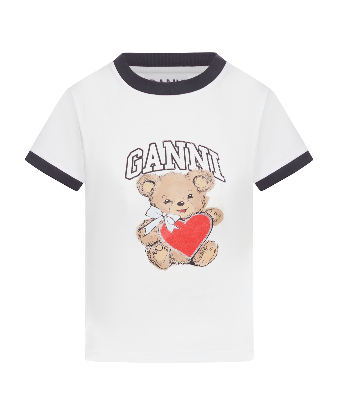 -Round neckline -Short sleeves -GANNI logo -Front placed print -Neck and sleeve hem with contrasting black profiles -White