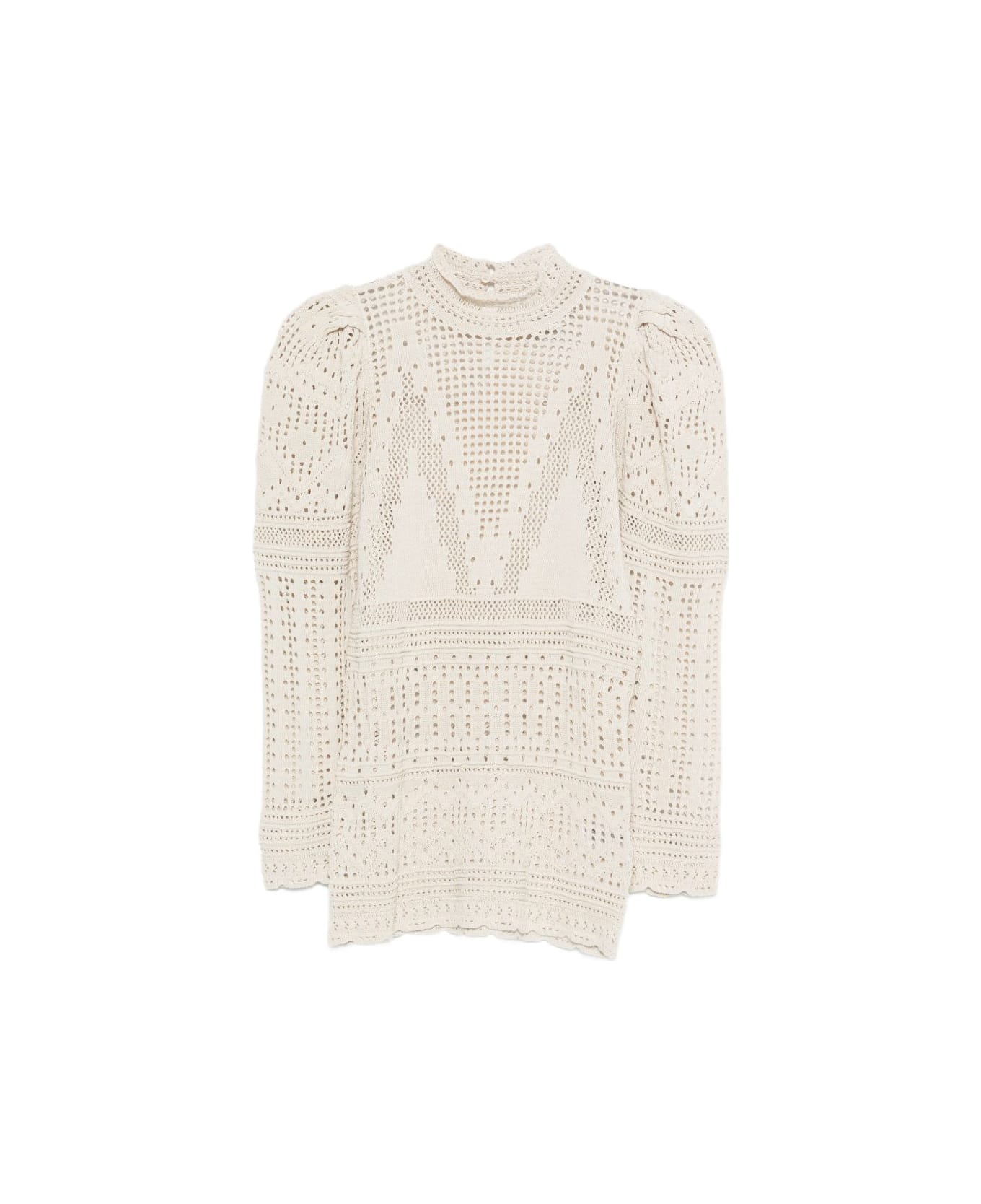 light beige crochet knit high neck long sleeves geometric pattern open knit construction Composition: 45% Cotton, 30% Viscose, 25% Paper