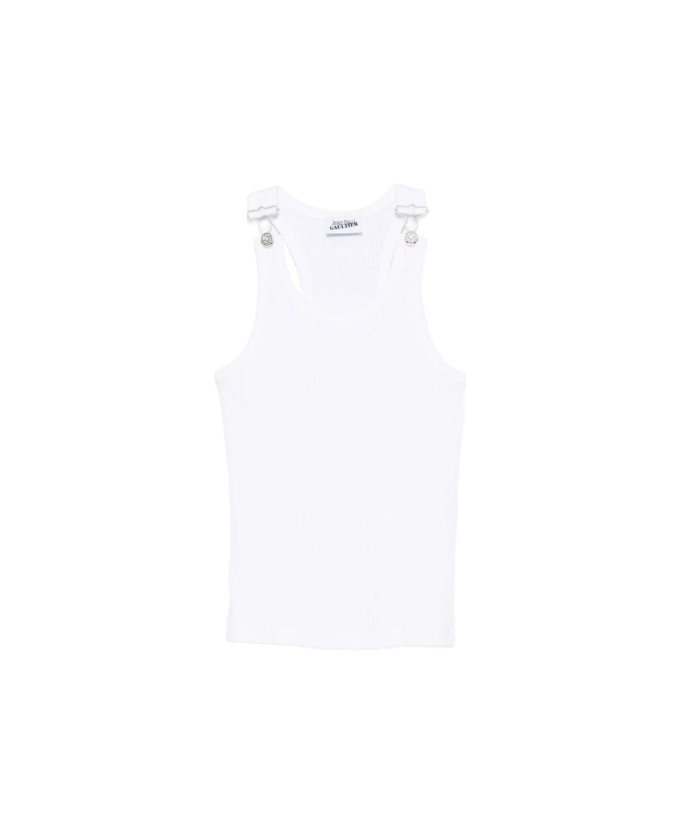 white ribbed fabric sleeveless round neck embellished straps clasp fastening