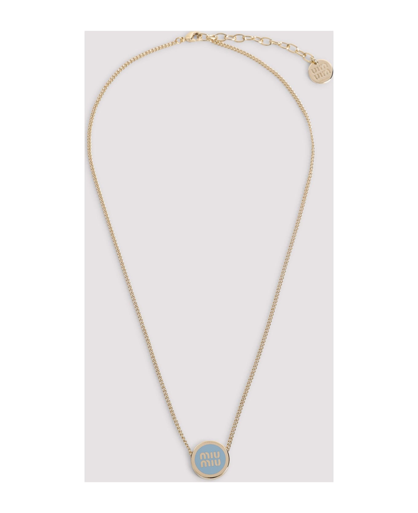 Miu Miu Celeste Brass Necklace. Golden-finish brass, fine chain, celeste enameled round-shaped logo charm, adjustable fit, lobster claw claps closure, round charm with embossed logo at the back.