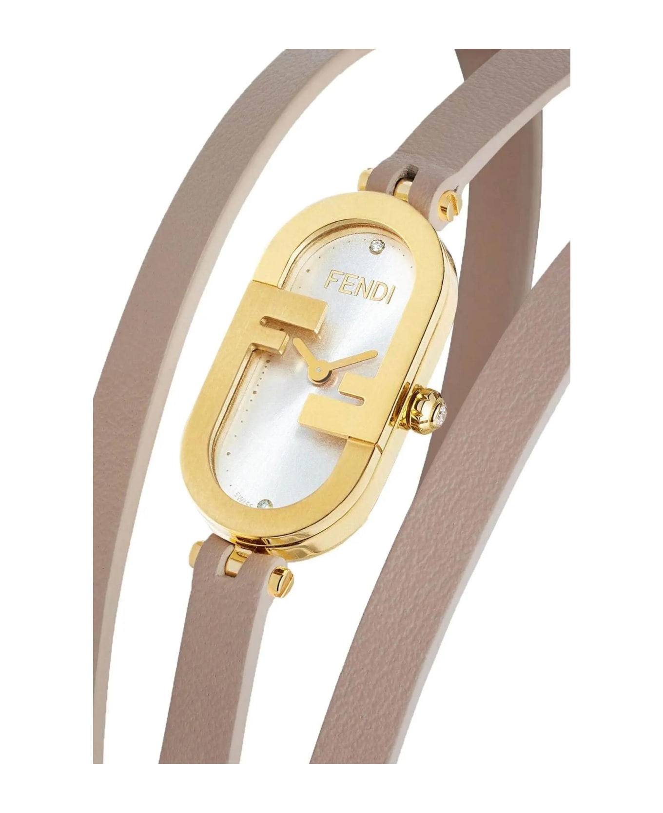 Gold-coloured stainless steel oval case 14. 80 x 28. 30 mm, with Fendi O Lock-shaped bezel. Crown with 1 inset diamond, around 0. 02 carats. Silver-coloured, sunray dial, indicators with inset diamonds at 12 o clock and 6 o clock, totalling around 0. 01 carats, gold-coloured minute and second hands with radius cut. Adjustable leather strap.