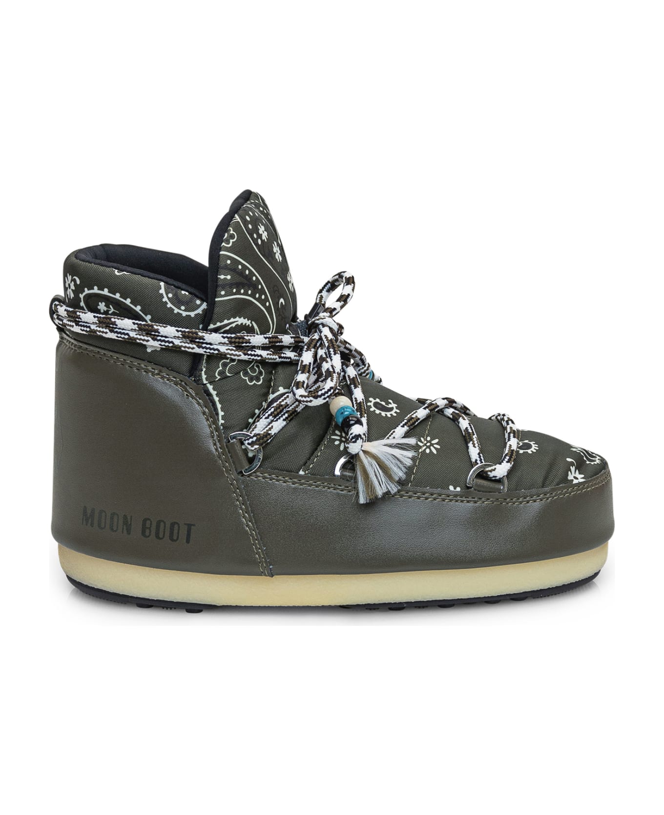Green boot. Lace-up closure. Lettering on the side. Logo on the heel. Bandana print.