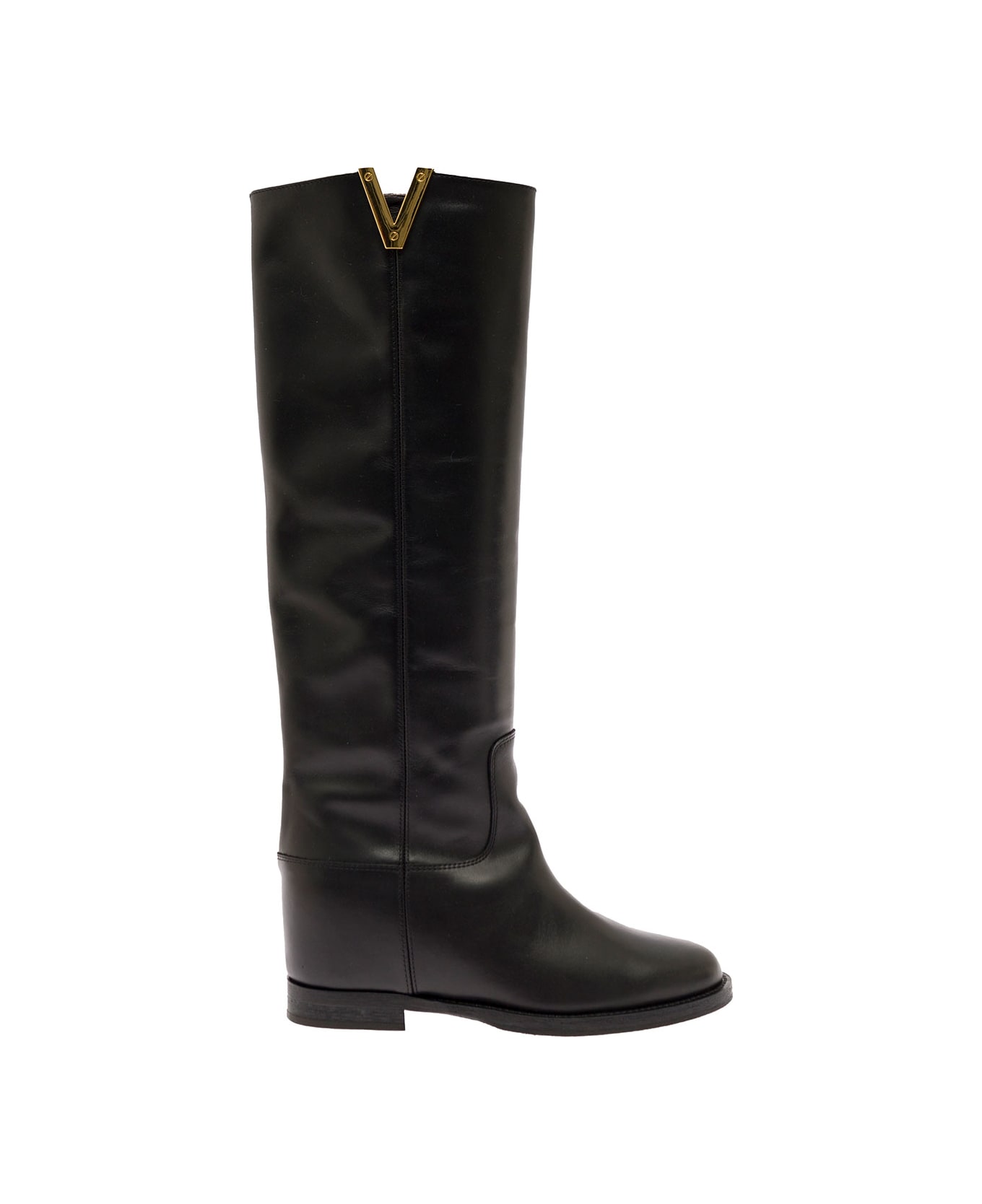 Black Leather Boots With Metal V Logo Detail Via Roma 15 Woman