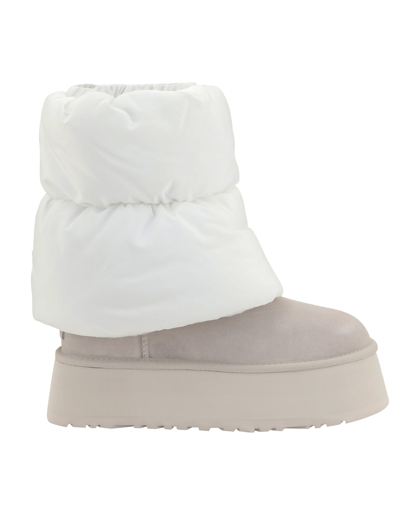 Leather classic mini dipper puffer boots by ugg, knurled platform sole, round toe, soft shearling lining, iconic brand monogram appliqué on heel, raised stitching, suede design, padded nylon overlay on shaft.