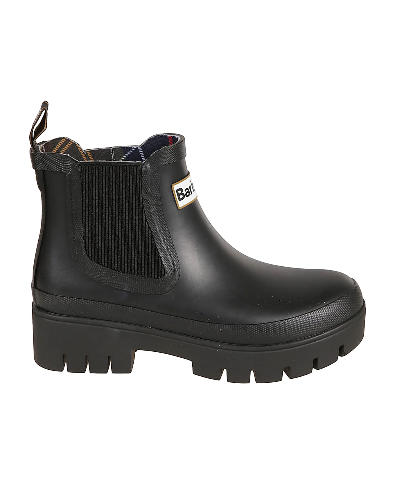 Rubber ankle boots with elastic side bands and a high rubber lug sole in a contrasting color. Logo patch on the front. Faux fur lining.