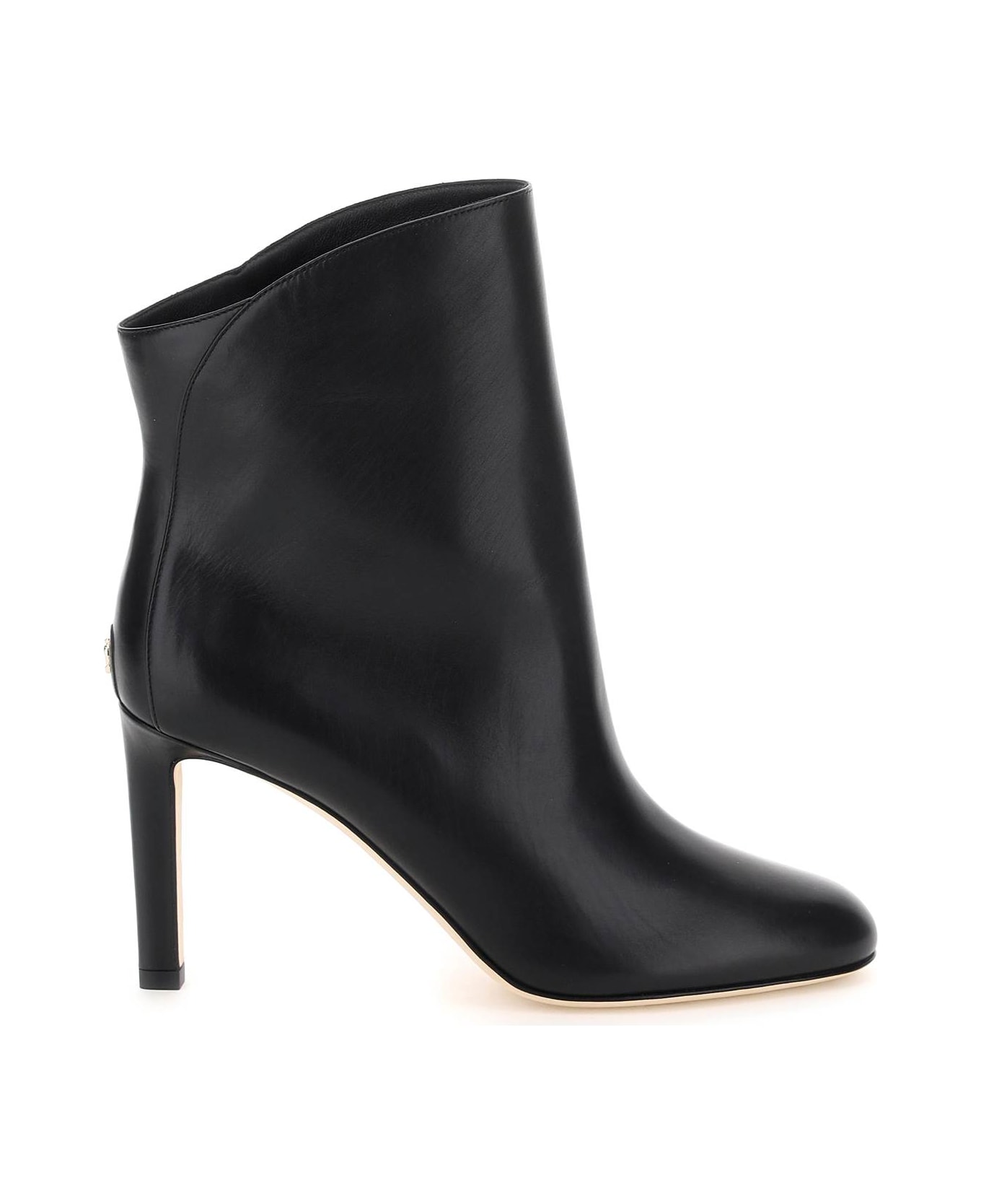 Karter 85 ankle boots by Jimmy Choo in smooth leather, characterized by the asymmetrical edge curved on front. Gold-finished metal JC detail applied on the back, no closure design, leather lining, leather-covered heel, leather sole with rubber inlay.