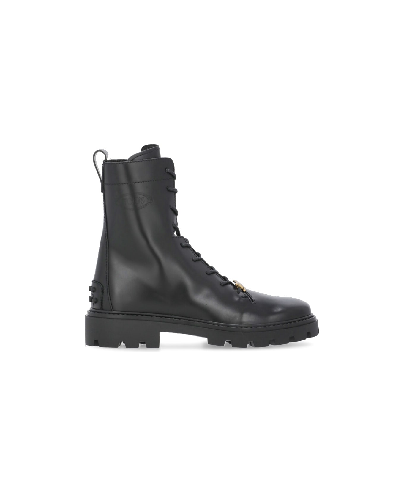- Black Tod's smooth leather combat boots for woman - Round toe - Front contrasting color iconic chain logoed detail - Front laces fastening - Side zip fastening - Side tone on tone logo - Rear gommino