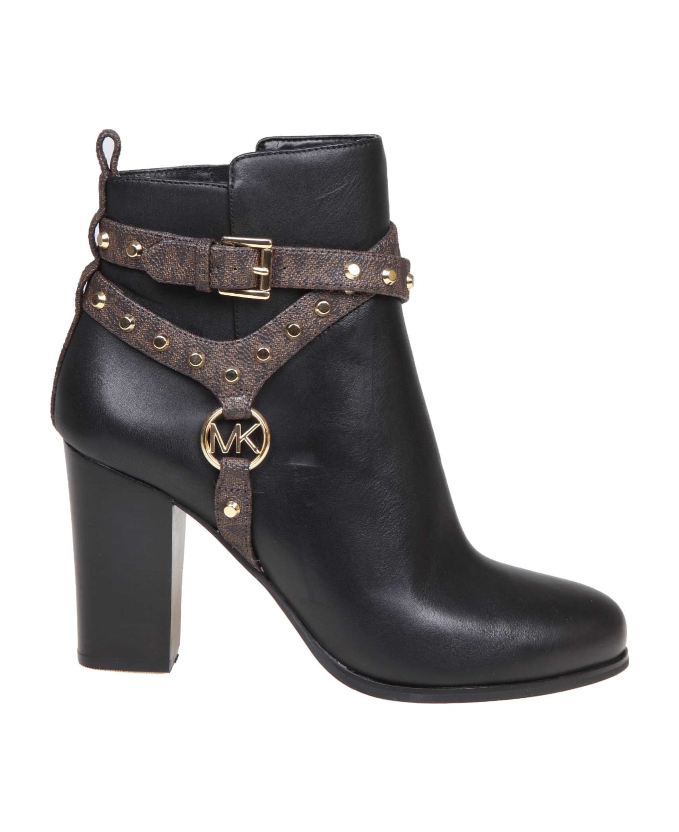 Leather ankle boots black colour internal side zip closure buckle in contrast with logo print decorative studs leather interior rubber sole