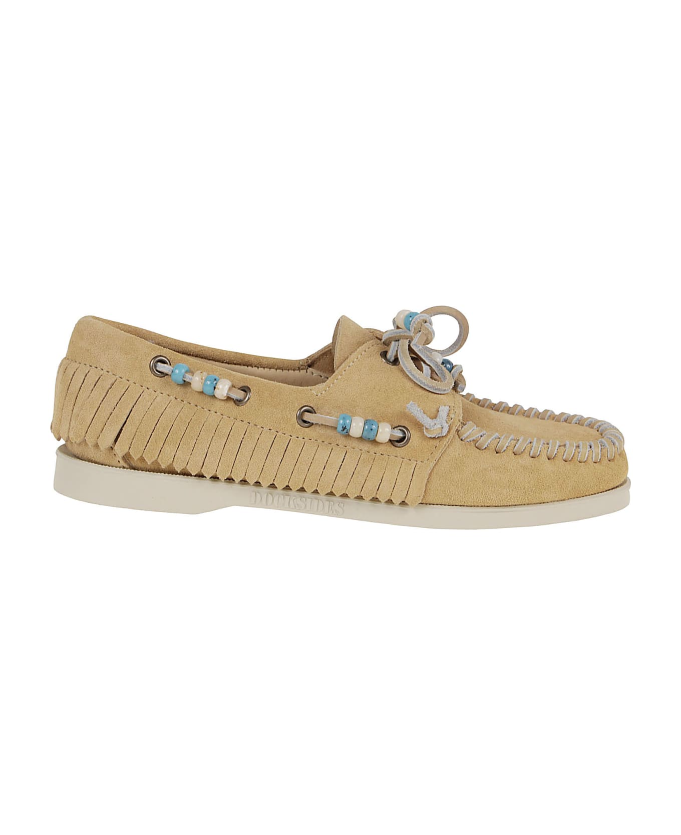Dockside moccasin in suede leather BY ALANUI. Round tip; front closure with bow; flat rubber sole. Featuring contrast beading and tone on tone fringes. Ideal to be worn both with a dress, or with trousers or shorts, also present in the SS21 collection of the brand, for a comfortable but fashionable outfit!