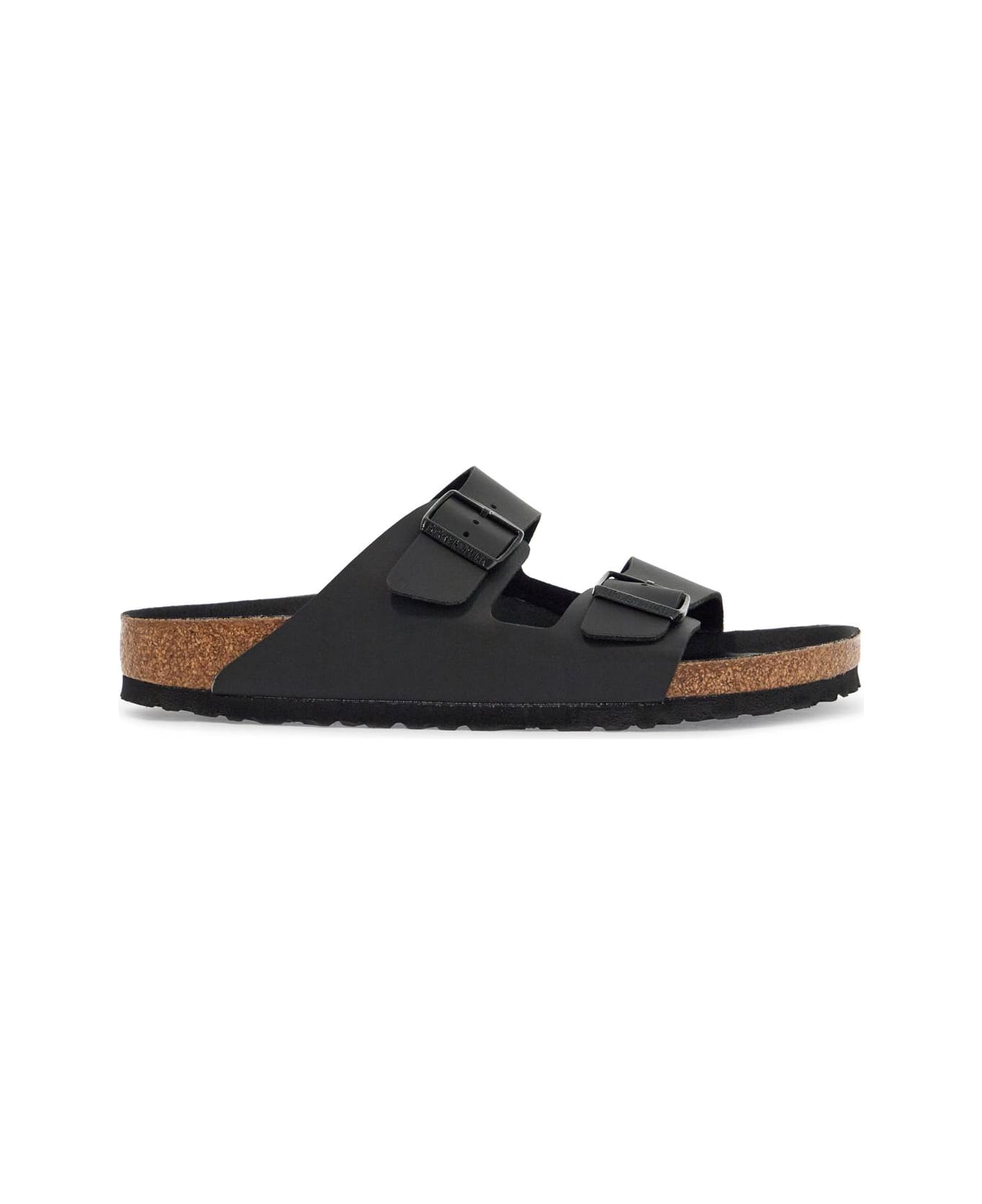 Arizona slides by BIRKENSTOCK made in Birko-Flor®with double adjustable strap with painted metal buckle tone on tone with debossed logo. Microfiber footbed, moulded cork and latex sole and EVA tread.