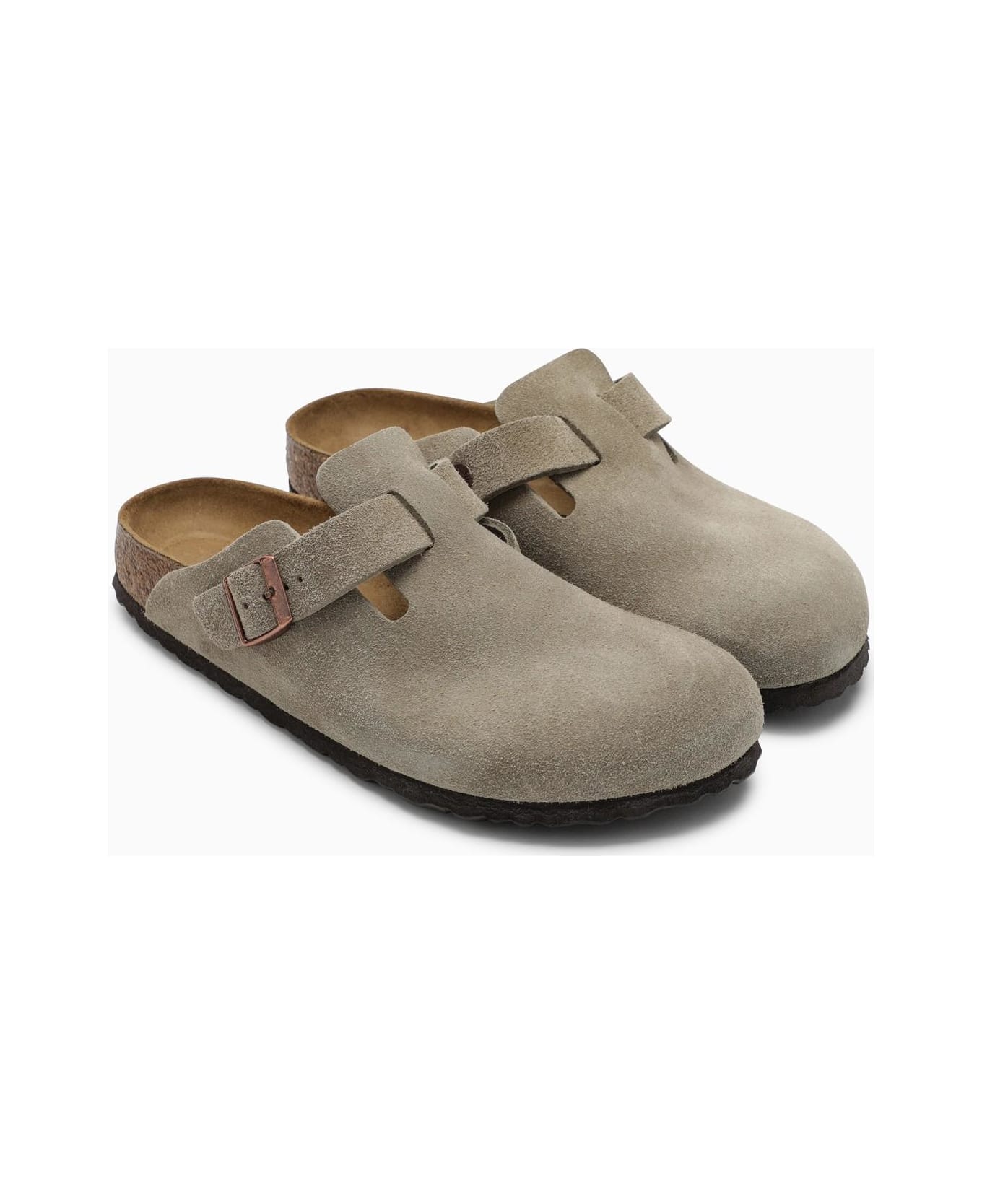 Sandal by Birkenstock in taupe Nabuk suede leather, featuring round toe, one strap with adjustable metal pin buckle, soft anatomically shaped footbed and EVA rubber sole.
