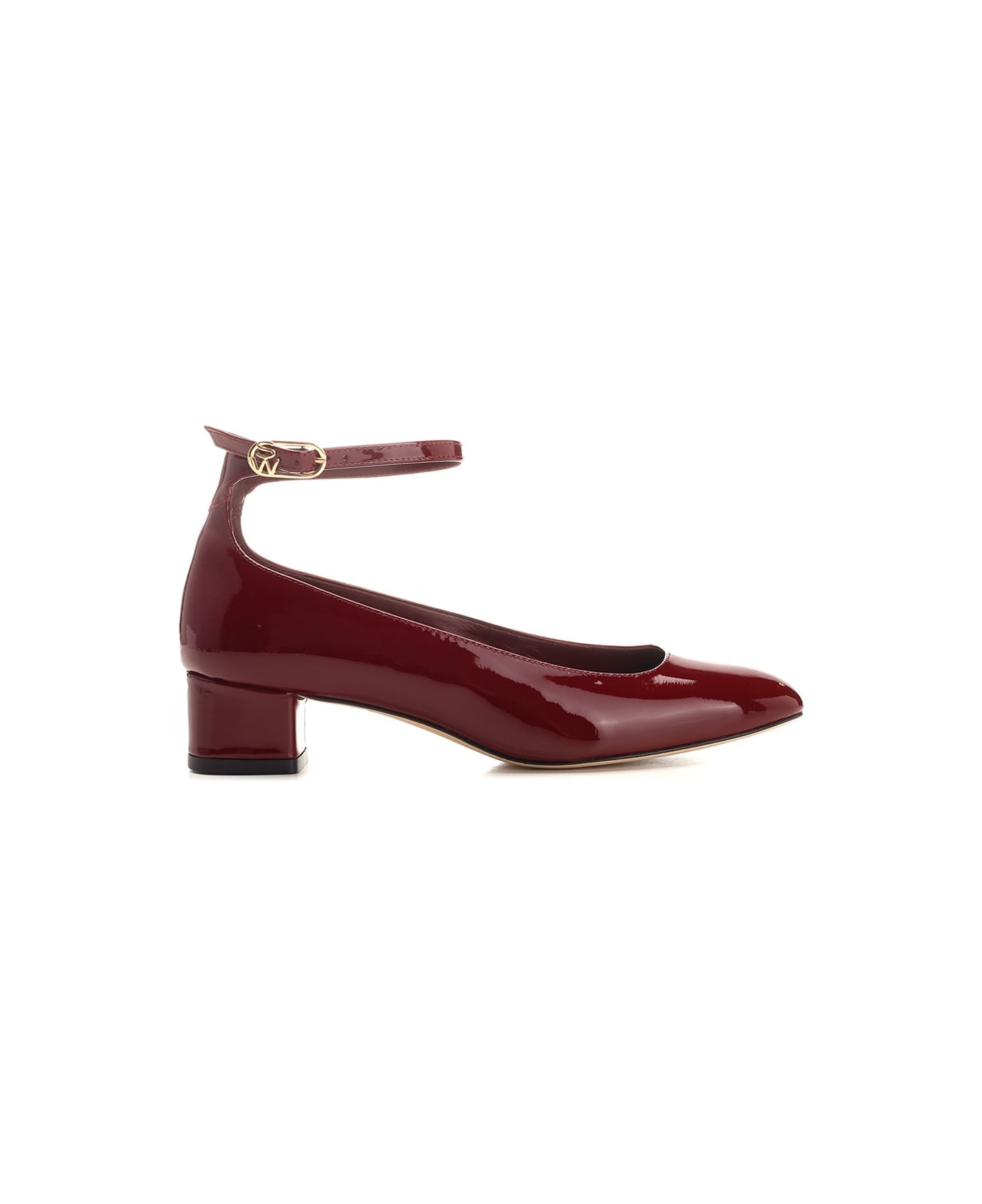 Mary Jane in burgundy patent leather with low heel and square toe from Stuart Weitzman.