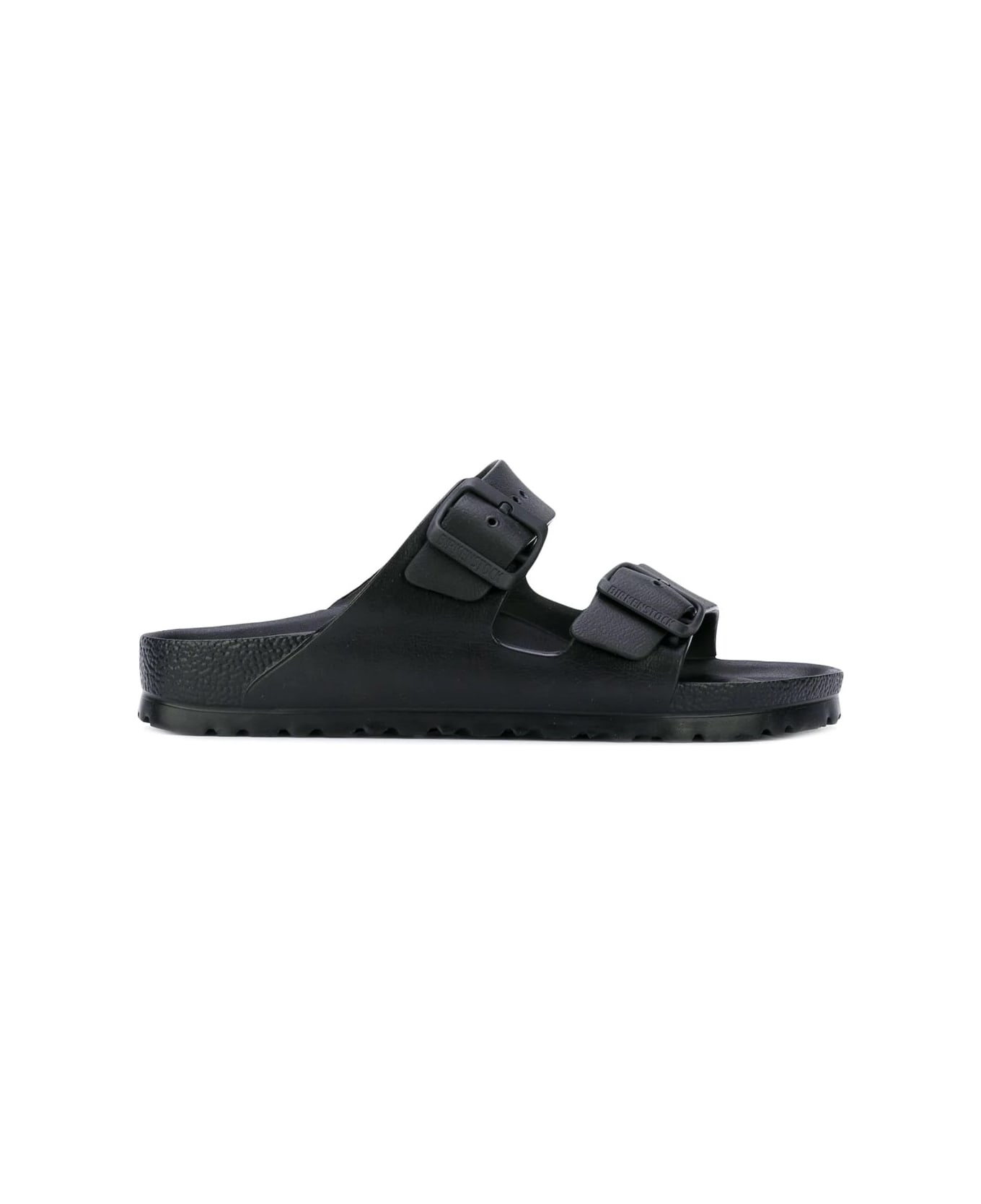 Arizona Sandals from Birkenstock: Black Arizona Sandals with open toe, side buckle fastening, slip on style and branded insole. 100% Rubber