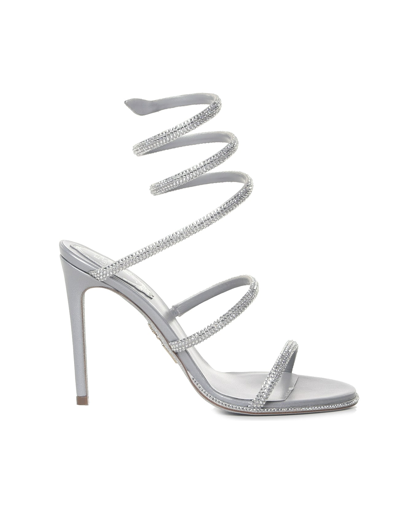 Grey satin Cleo Sandals With Crystals from René Caovilla -Cleo sandals with crystals -Heel height: 105mm -Rounded toe -Spiral around the ankle -Straps with crystals -Leather sole -Made in Italy -Colour: Grey -100% calfskin