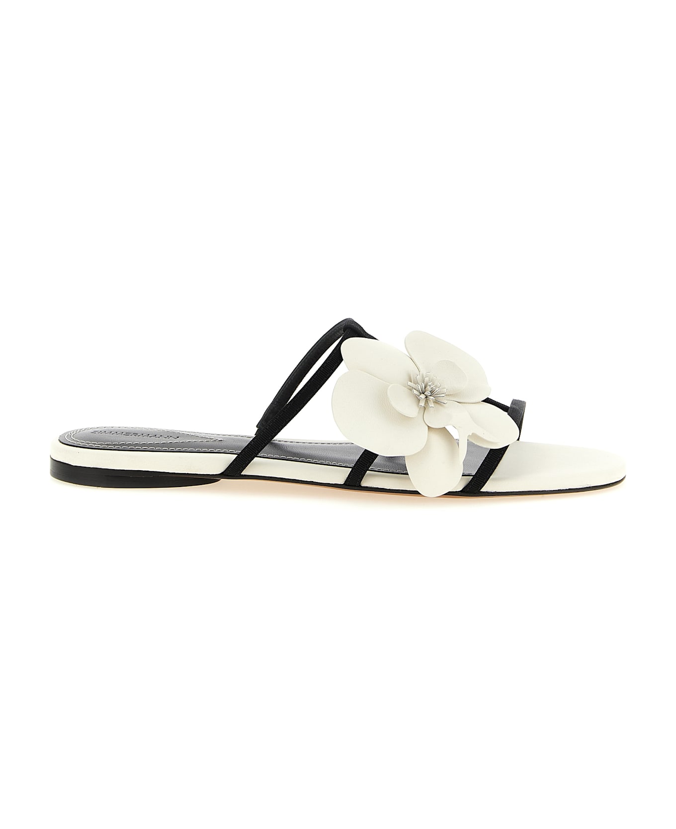 Leather slides with grosgrain straps, contrast leather 'Orchid' details on the front with asymmetric design, leather sole.