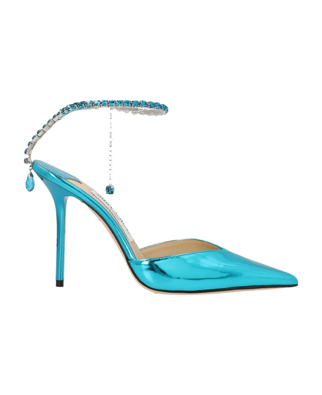 'Saeda' metal leather pumps with crystal straps and pointed toe.