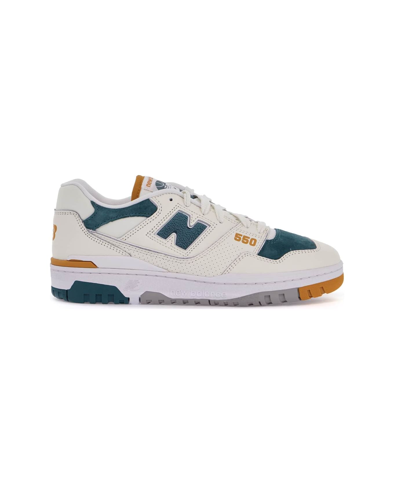 The New Balance 550 sneakers are made of smooth leather with suede inserts and contrasting details. They feature side perforations, the iconic 'N' in terry fabric on the sides, a printed 'NB' logo on the back, and a '550' print on the side. The padded tongue is made of technical fabric with a fabric logo patch, while the spoiler is made of technical fabric. The interior is lined with fabric and has a removable insole. The rubber sole has an emb
