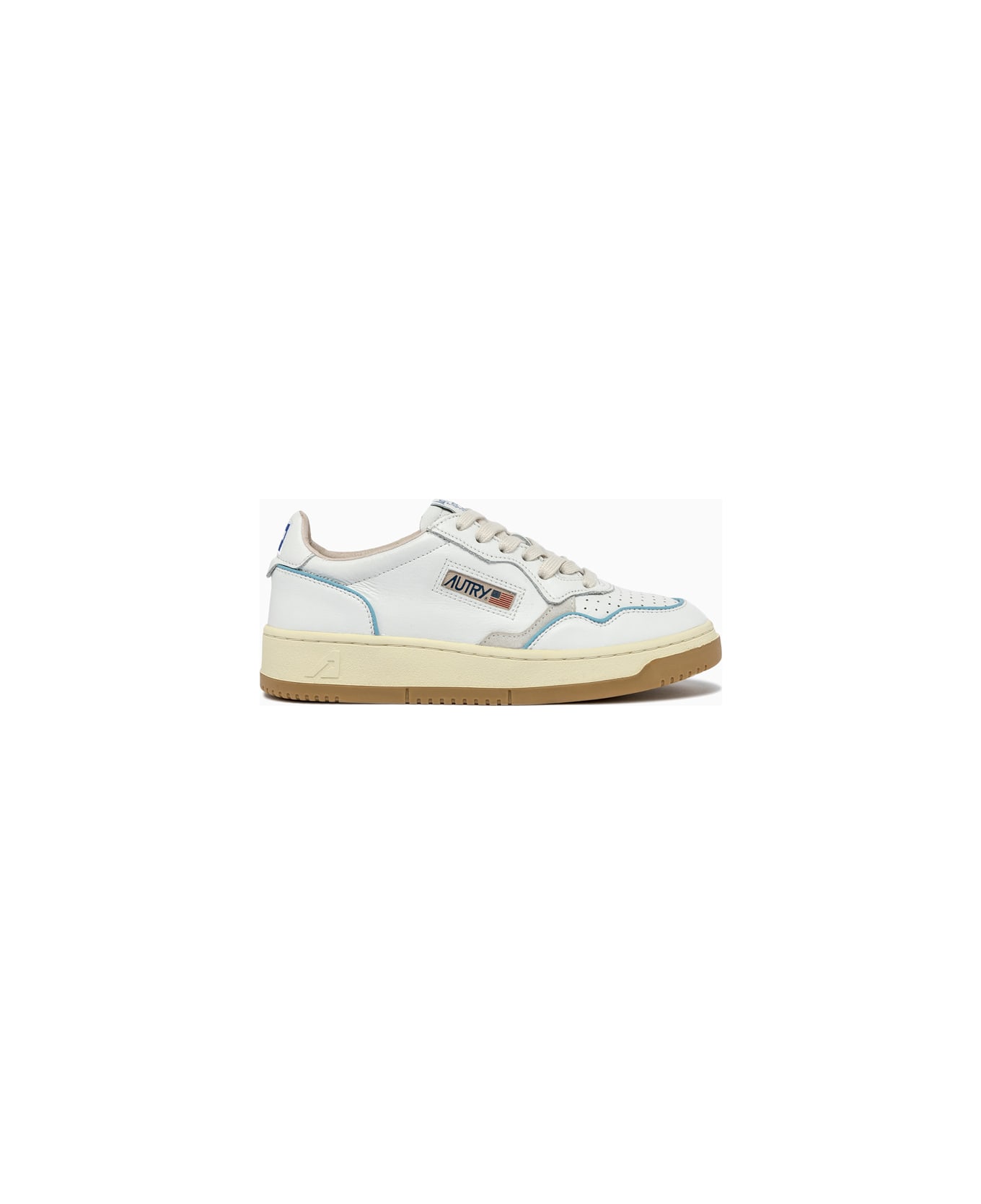 1980s vintage style Sneakers. Leather upper with tonal leather inserts and contrast profiles. Suede insert with contrast embroidery logo on outer side. Perforated toe for better breathability. Flat cotton laces. Tonal label seamed on a leather tongue. Padded ankle collar with embroidery logo in contrast at back. Leather and cotton terry lining. 2 cm-high raised sockliner in leather. Sole in two-color rubber with logo. Height of sole: 2. 5 - 3. 5 cm. Shoe bag included. Italian size system.
