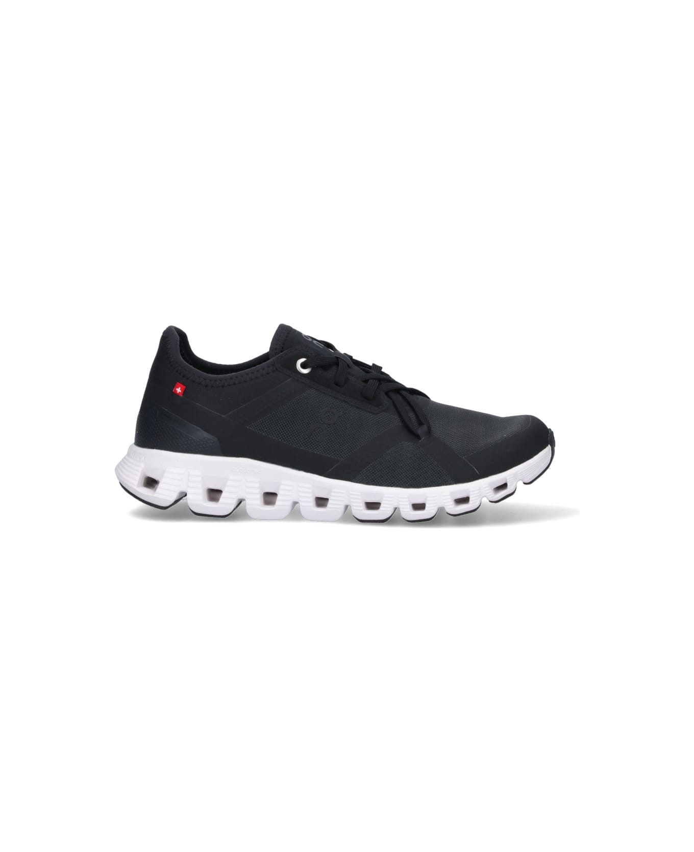 ON 'Cloud X3' lace-up sneakers in black mesh with round toe, red label on the side, white rubber sole.
