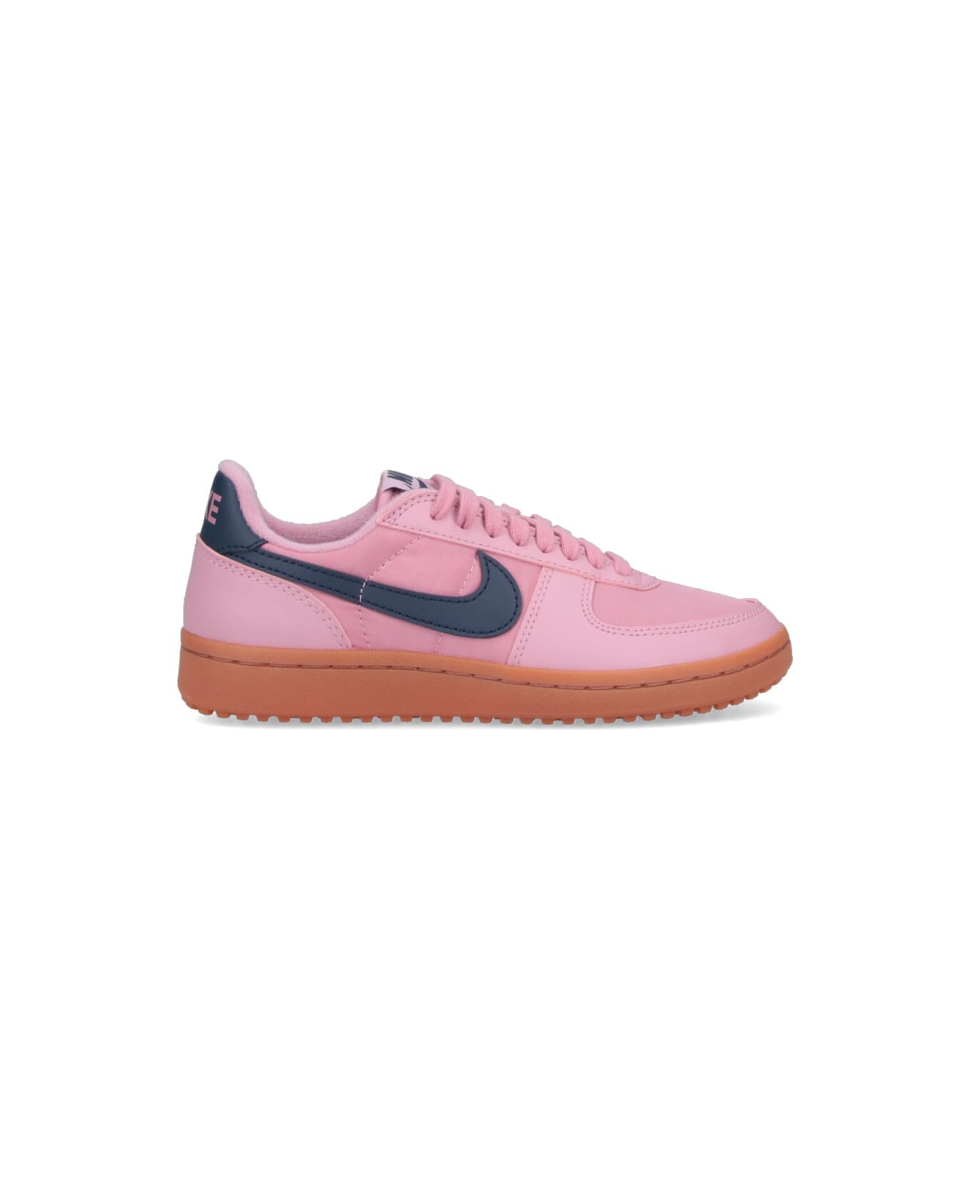 Nike "Field General" sneakers in pink fabric with leather trim, round toe, lace-up closure, logo label on the tongue, black leather "Swoosh" logo on the side, black leather back tab, pink logo print detail, textured rubber sole.