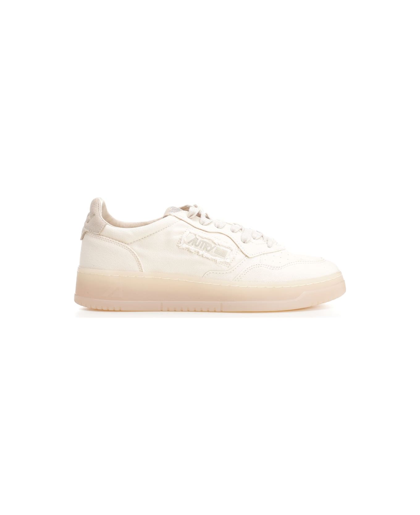 "Medalist" low ivory canvas sneakers by Autry. Tone-on-tone suede heel tab. Frayed side logo. Semi-transparent sole.