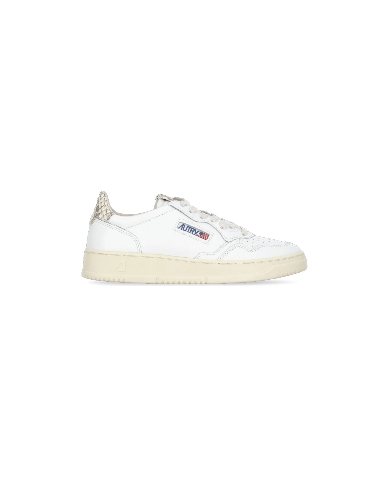 - White Autry leather sneakers for woman - Round toe with breathable details - Front laces fastening - Tongue with contrasting color embroidered logo - Side contrasting color logo - Upper heel with contrasting color animalier pattern
