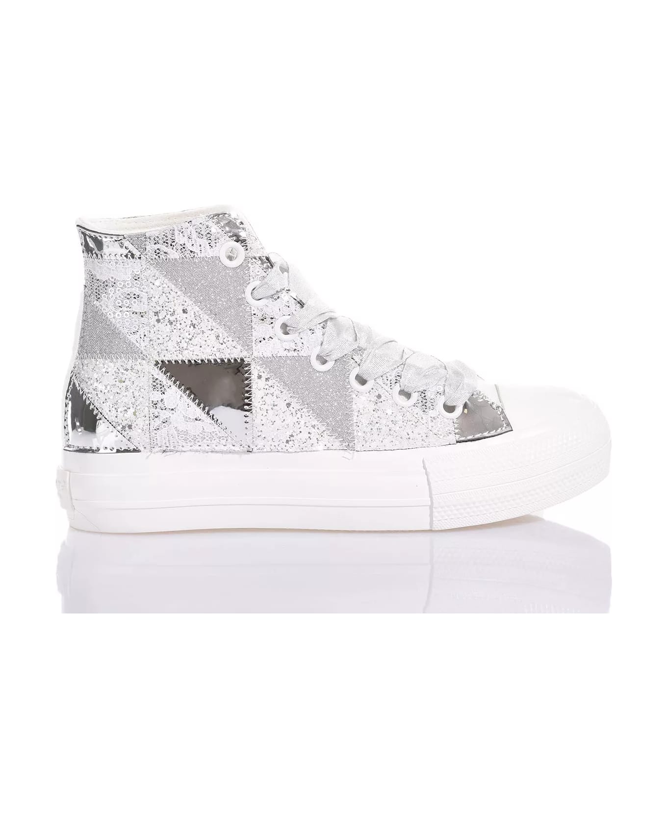 Mimanera Airlines Platform Silver Patch is the versatile and elegant sneaker of this season. Inspired by the classic Converse model, these sneakers with an all-white platform sole are designed to elongate the figure while ensuring exceptional comfort. Entirely covered in a finely crafted patchwork with various premium materials, all in silver tones for a glamorous and sophisticated look. The look is completed with silver laces and lurex details. This model runs slightly large, so if you wear a half size (e. g. , 36. 5), choose size 36.