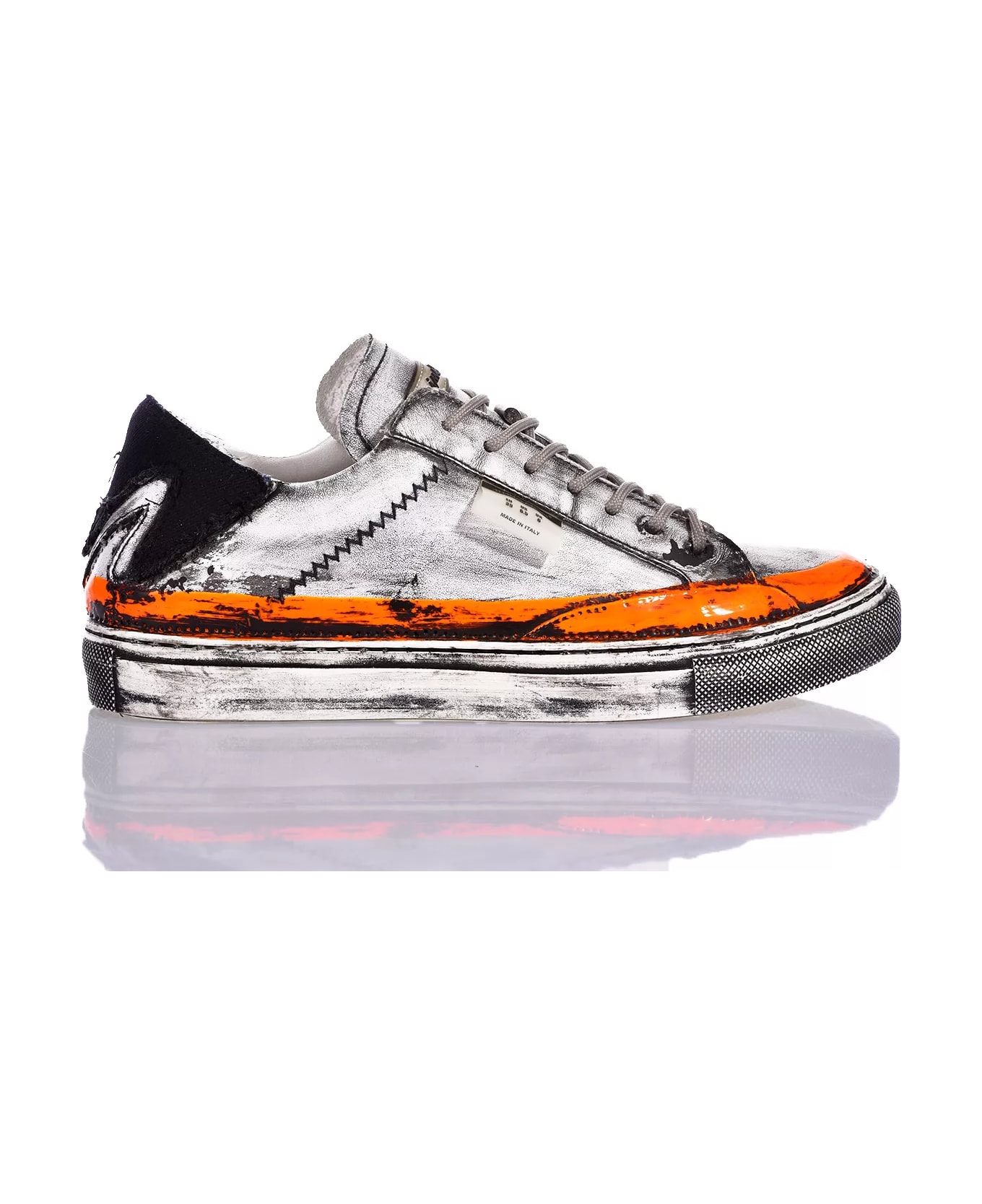 Cattle hide in black and whiteHeel patch in cattle hide with white and black python printStone washed treatmentOrange fluorescent rubberized finishSatin side labelGray lacesUpper: 100% cattle hideLining: 45% cattle hide, 55% cottonSole: 100% rubberHandmade100% Made in Italy