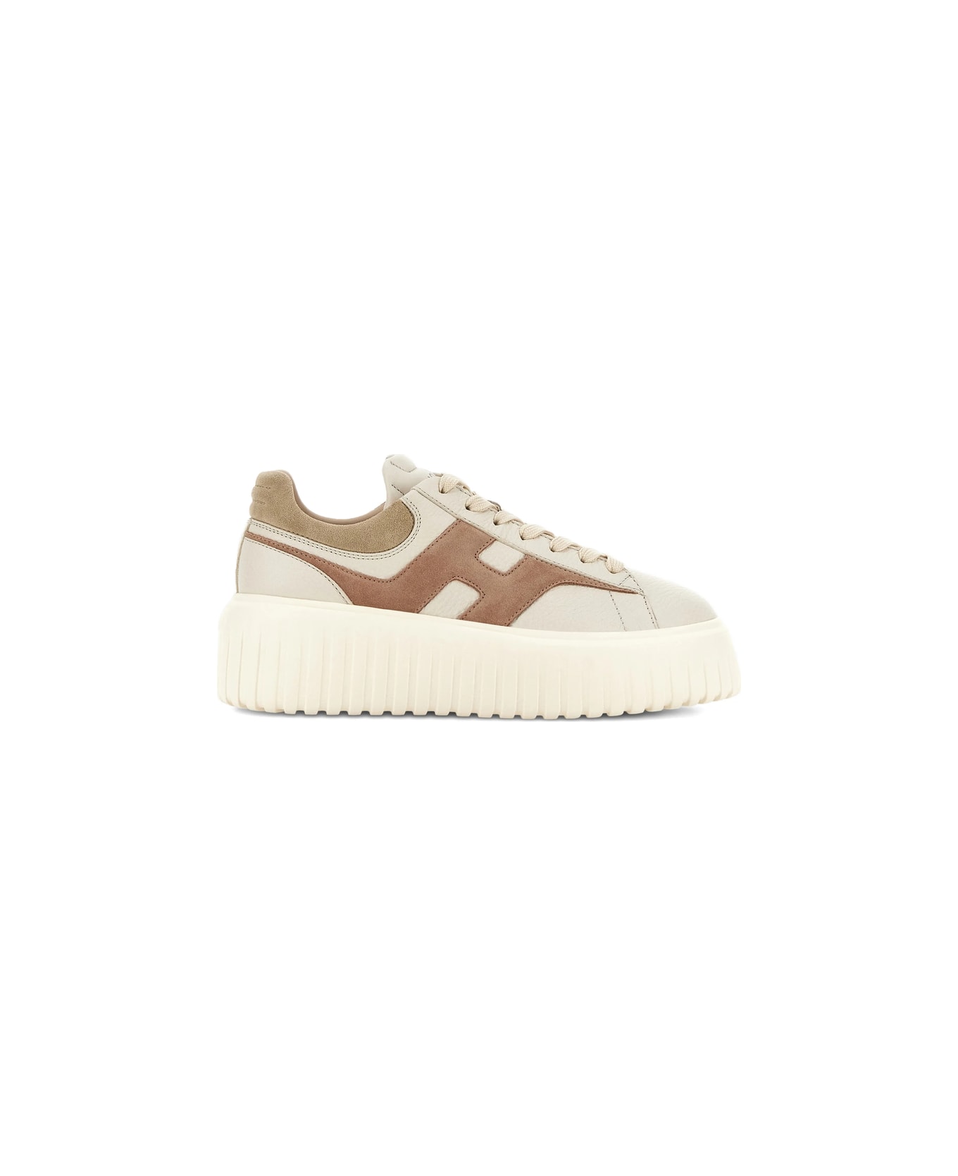 light beige platform sole lace-up fastening leather upper suede detailing 'h' logo stripe