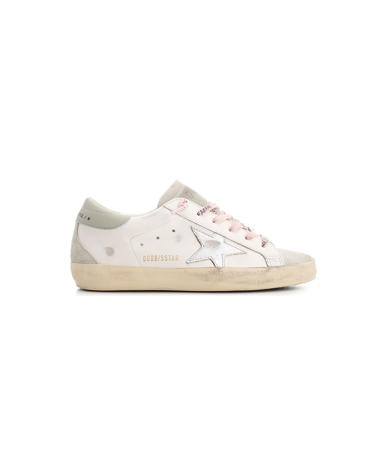 White "Super-Star" sneakers from Golden Goose in leather, star in laminated silver, insert on the back and tongue with ice gray suede tip, ice gray leather heel, logged pink laces, vintage treatment.