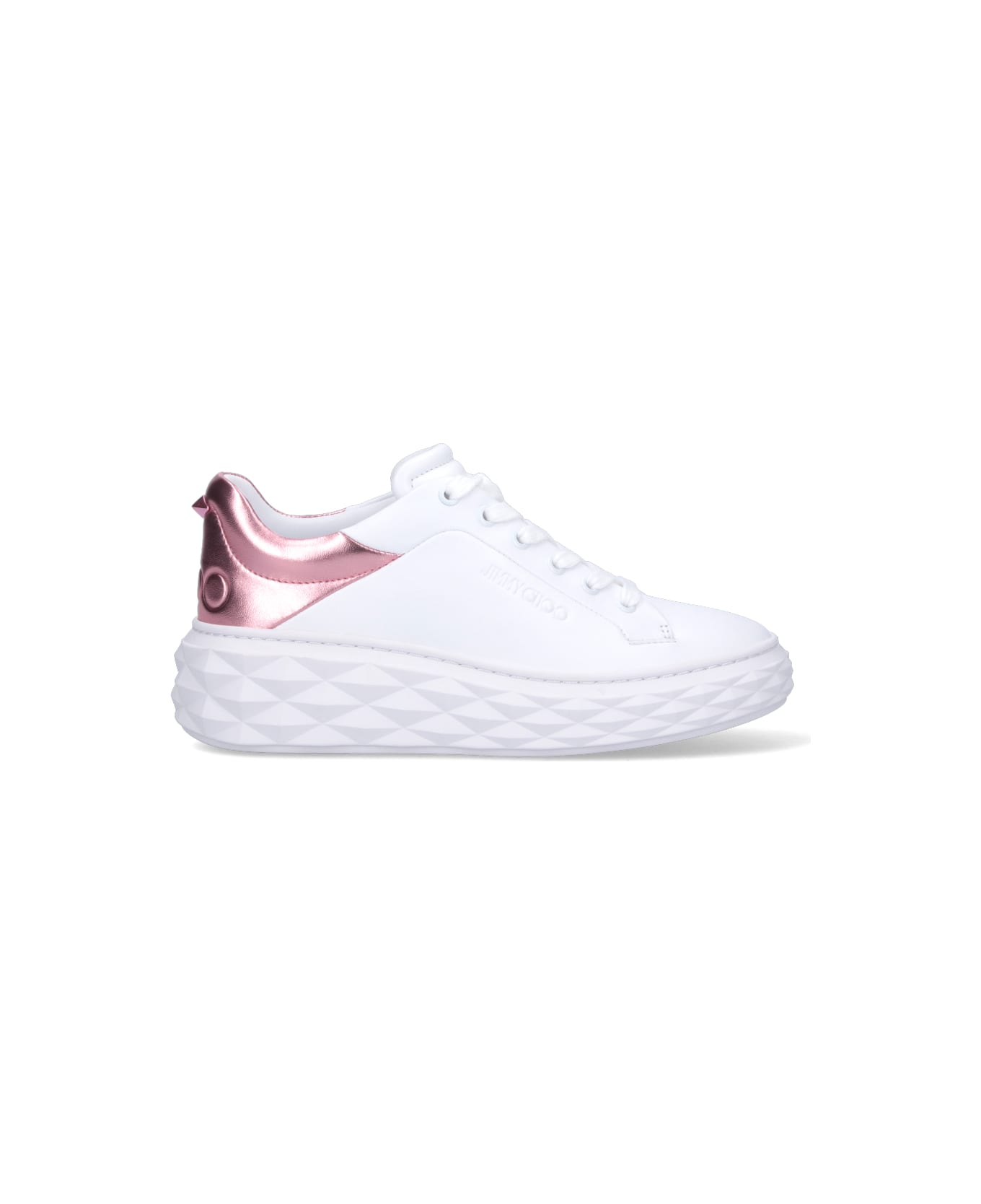 Jimmy Choo Diamond Maxi sneakers in white nappa leather with pink leather details, metallic effect, oversized design, round toe, laces, embossed logo on the side, embossed logo on the tab, pink metal Diamond application detail, tone-on-tone rubber textured platform sole, faceted Diamond pattern detail.