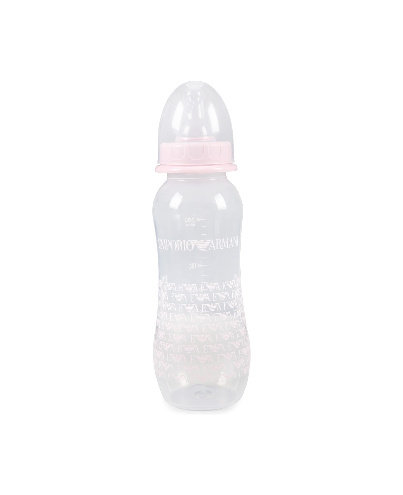 Pink childcare set, composed of two bottles, pacifier and chain with clip; the bottles have silicone teats and closing caps for use outside the home. Both are made of BPA free plastic for greater safety. The bottles have capacities of 250 ml and 125 ml. They are embellished with the iconic eagle and logo.