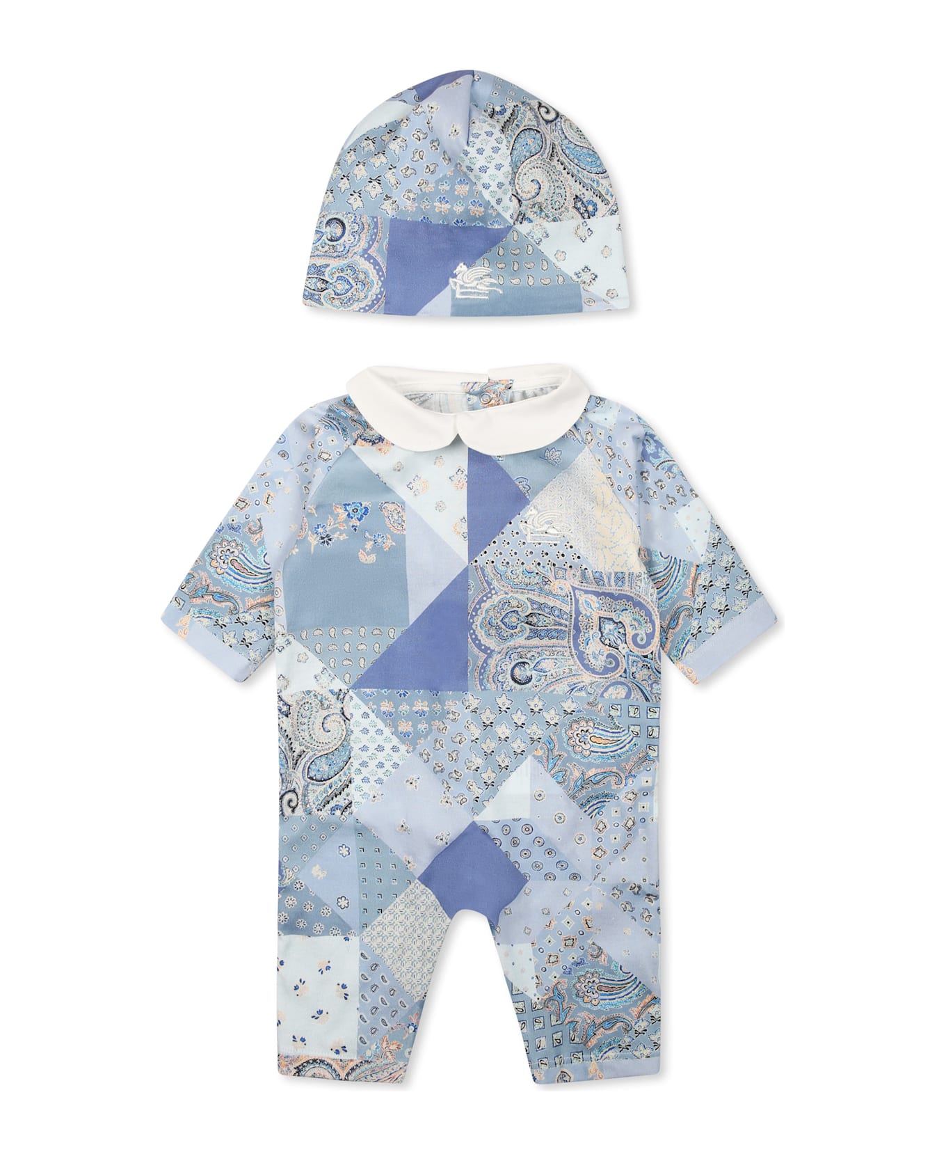 Light blue cotton babygrow set, composed of babygrow and hat; long-sleeved romper, with white peter pan collar and snap button closure on the back and between the legs. It is embellished with Paisley patchwork print and embroidered Pegasus.