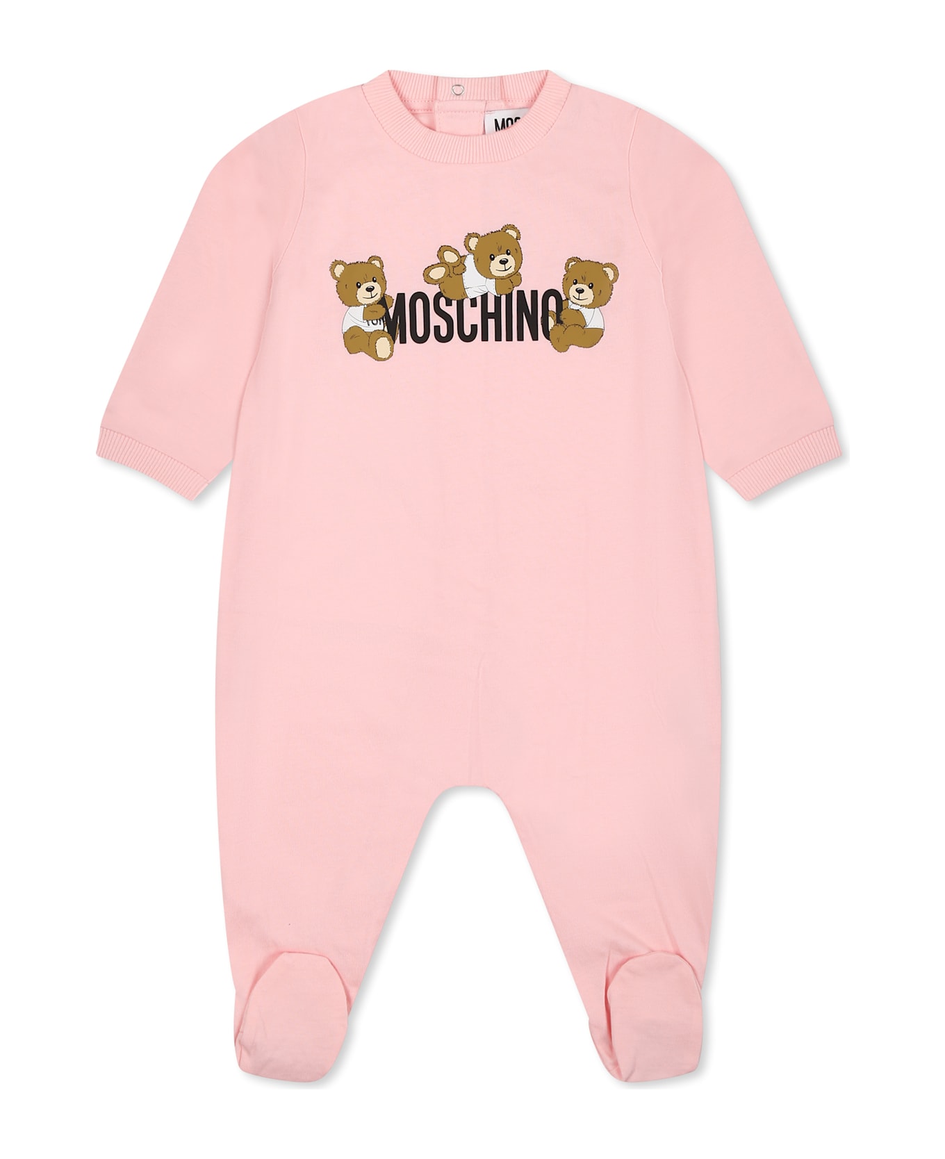 Pink babygrow from the Moschino Kids brand, in cotton, with long sleeves, ribbed crew neck and cuffs, feet and snap buttons on the back. It is embellished with three Teddy Bears and logo on the front.