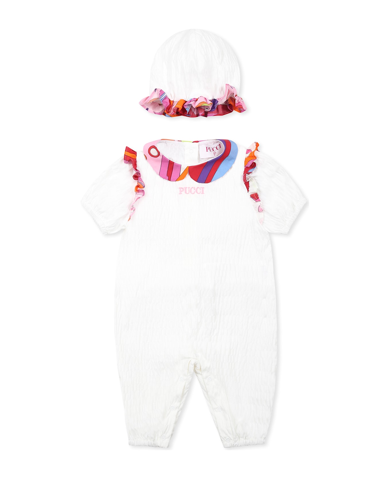 White romper set, composed of romper and hat. Romper with short puff sleeves, peter pan collar, ruffles on the shoulders, snaps on the back and between the legs and elasticated ankles; decorated with marble print and embroidered logo on the front. Hat with marble print ruffles.