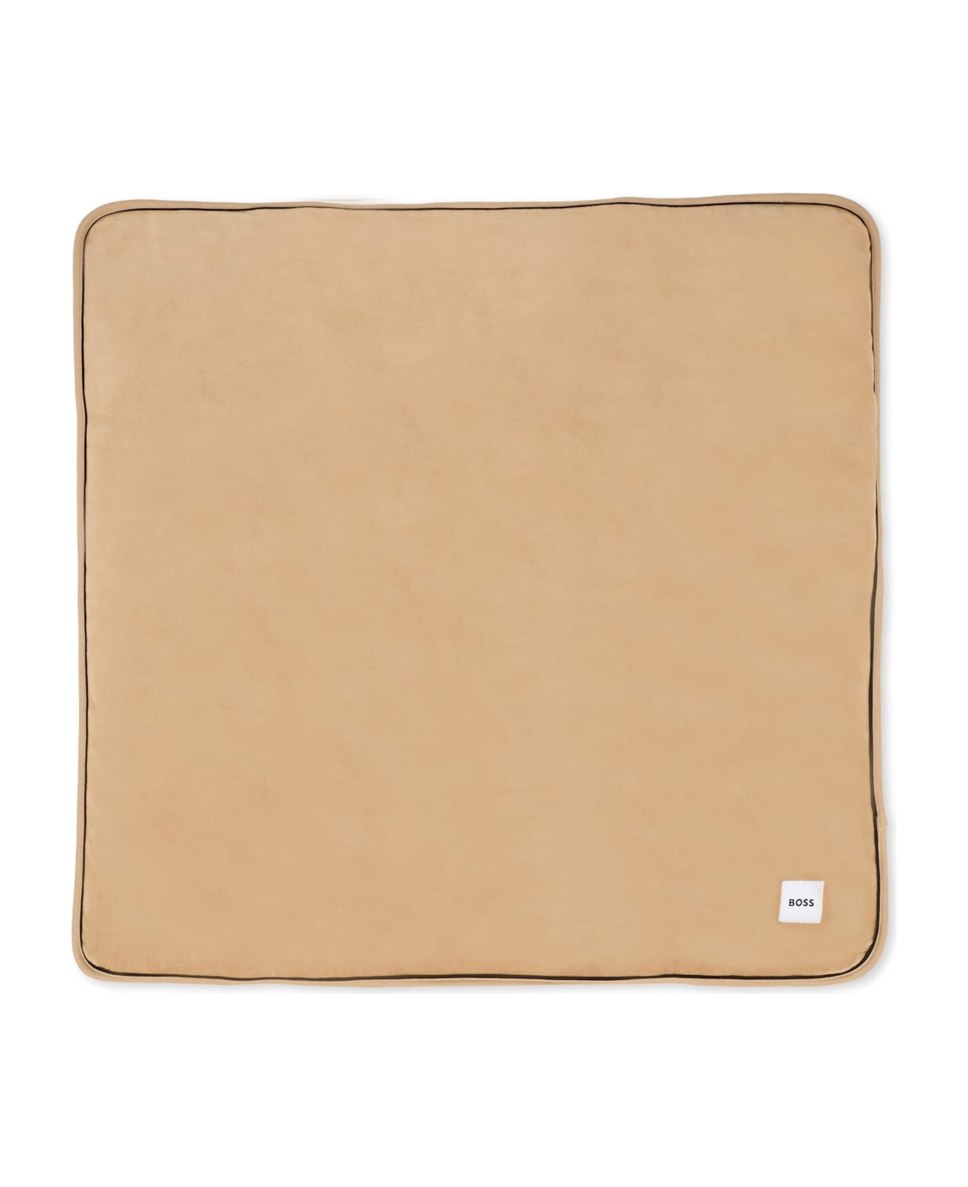 Beige and white reversible chenille blanket, lightly padded; made of an organic cotton blend. One side is embellished with a logo patch; the other side features a logo print. It features a hook-and-loop closure with a handle.