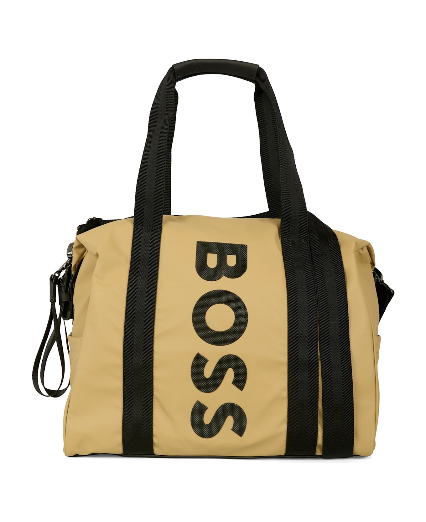 Beige changing bag with handles, top zip closure, adjustable and removable shoulder strap, side pockets, back pocket, and stroller straps; includes an internal changing mat. It is embellised with a black rubberized logo on the front.