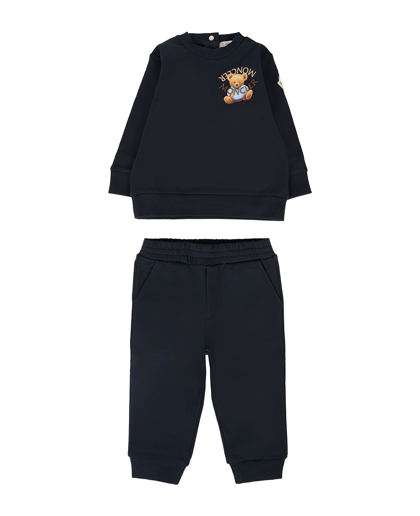 Blue cotton blend sweatshirt and pants set. The long-sleeved sweatshirt features a crew neck, ribbed cuffs, and hem. It is embellished with an embroidered logo and teddy bear on the chest and an iconic logo patch on the sleeve. Trousers with elasticated waist, side pockets and ribbed cuffs.