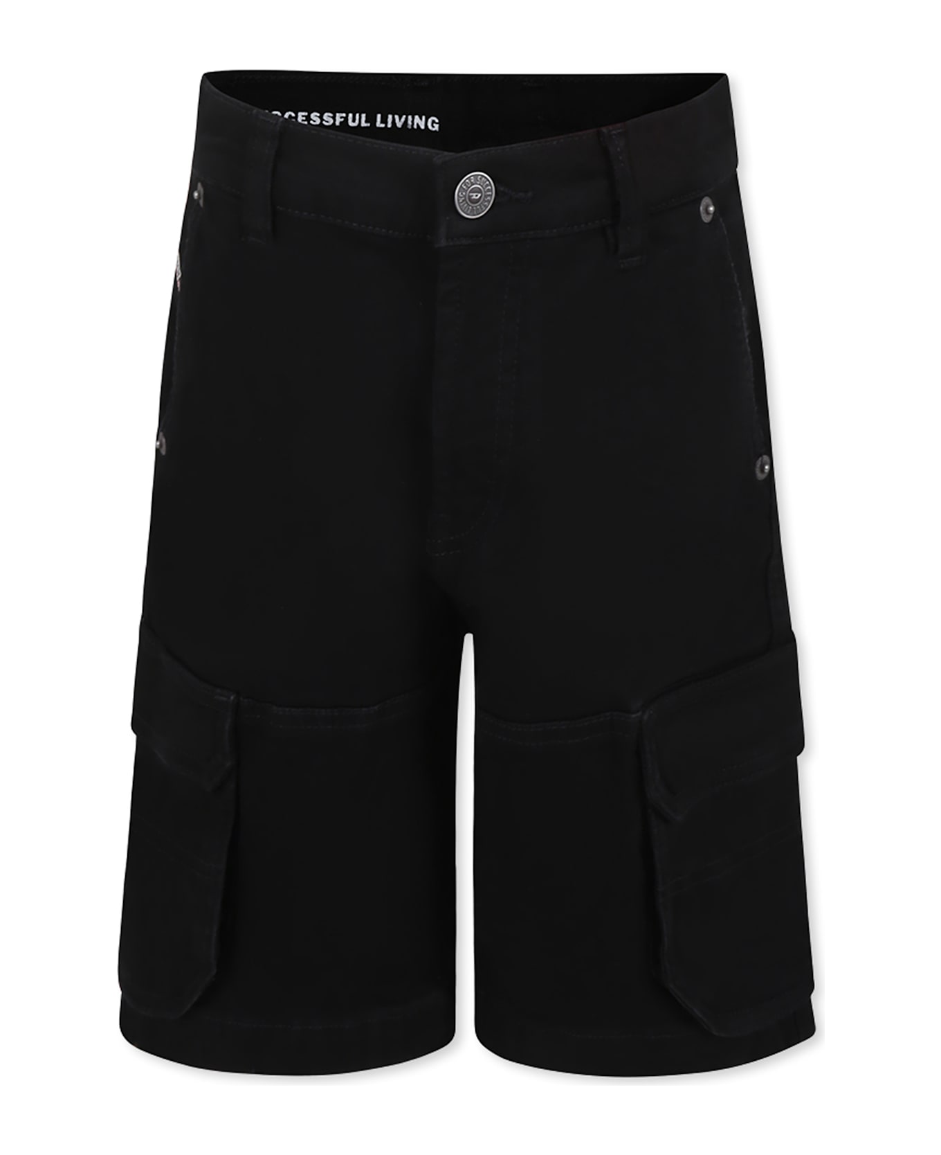Black shorts with belt loops, front zip and button fastening, adjustable waist with internal elastic with buttons, side pockets, back pockets and cargo pockets on the sides. They are embellished with logo patches on the front and back.